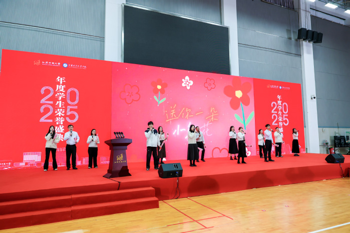 盛典尾声,师生代表共唱《送你一朵小红花》。老师们手持红色鲜花为学子们送上祝福,歌声与花香交织,定格师生同心的动人瞬间,为这场“逐光向新”的荣耀盛会画上圆满句号。