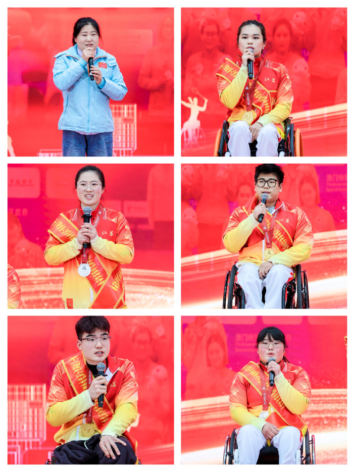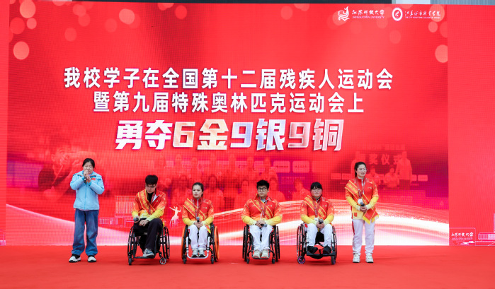 公共管理学院开放在籍学生和校友在全国第十二届残疾人运动会暨第九届特殊奥林匹克运动会上斩获6金9银9铜的辉煌战绩,书写了优秀学子自强不息、奋勇争先的动人篇章。教练员严会莲及获奖学生代表彭政扬、康苏、张平康、张梦云和黄路分享了为省争光、为校添彩的热血征程,他们用坚韧不拔的意志诠释了江苏开大学子的奋进底色,赢得全场阵阵掌声。