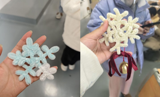 活动现场氛围热烈,专业指导同学通过清晰示范,让零基础的同学们也能轻松上手。工作人员提前准备了60份限量扭扭棒材料包,同学们免费领取后,跟随教学步骤有条不紊地制作专属雪花。大家充分发挥想象力与创造力,不仅完成形态各异的雪花作品,还延伸创作花环、挂件等特色手作。这些成品既可以装点宿舍、增添生活情趣,更让同学们在动手过程中切实感受创意带来的乐趣。