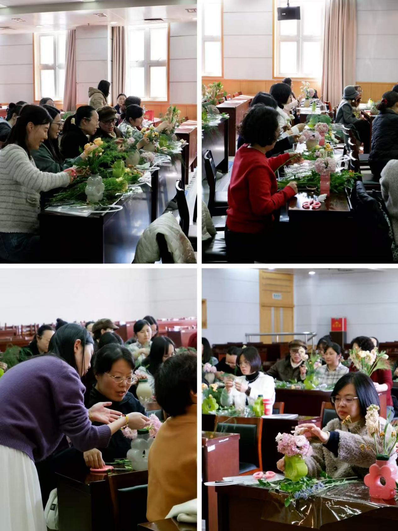 本次沙龙特邀专业花艺老师亲临授课,为大家带来专业细致的瓶插花指导。女教职工们兴致高涨、跃跃欲试,沉浸在亲手创作的乐趣之中。大家认真修剪花枝、精心挑选花材,结合自己的审美构思,将一朵朵娇艳的鲜花巧妙搭配、错落摆放,时而轻声交流创作心得,时而相互协助调整花材角度,现场笑语盈盈、暖意融融。