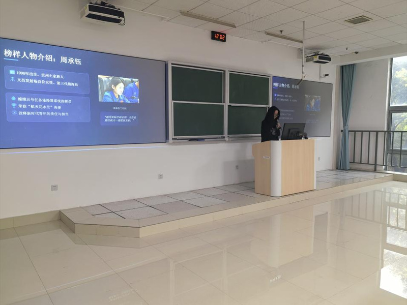 活动中,周颖同学介绍了我国嫦娥六号、天问系列、神舟飞船等重大航天成就。深入解读科技强国战略的深刻内涵,并重点讲述了文昌发射场首位女性指挥员、“航天花木兰”周承钰的奋斗故事。周承钰从国防科技大学学子成长为航天一线骨干,用坚守与拼搏诠释“特别能吃苦、特别能战斗、特别能攻关、特别能奉献”的航天精神,她用实际行动证明,女性也能在航天一线绽放光彩。周颖鼓励同学们以周承钰为标杆,坚定理想、勤学笃行,把青春奋斗融入科技强国建设。