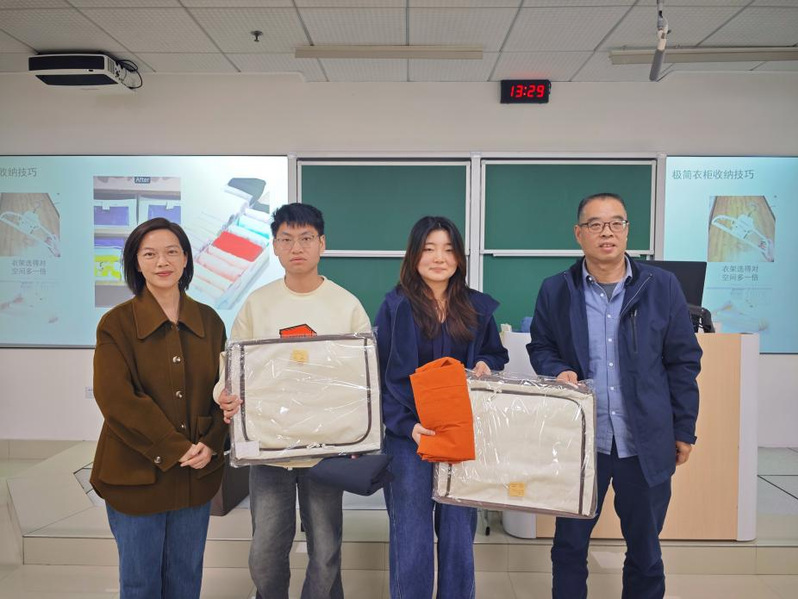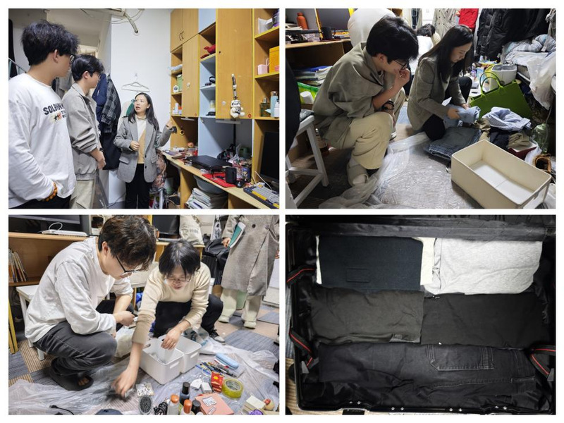 实践环节中,同学们进行收纳实操练习,将刚刚学到的知识运用到具体情境中。大家分工协作,互帮互助,现场气氛热烈,经过评比,两位同学的收纳作品获得优秀,王卫处长与包慧君书记共同为他们颁发奖品,鼓励他们将所学的技能带回宿舍,带动身边的同学共同营造整洁舒适的生活空间。