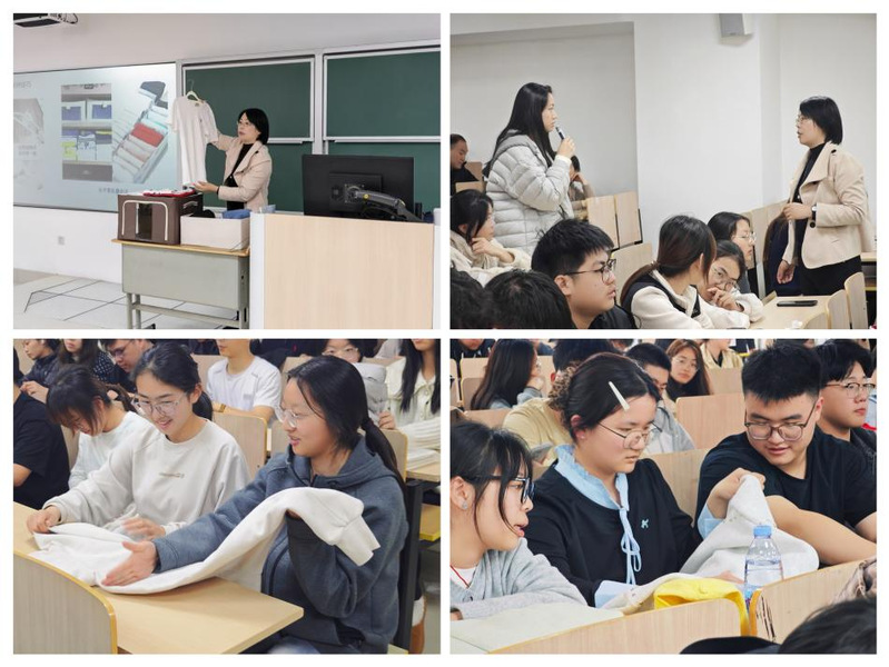 随后进行的技巧展示环节将课堂气氛推向高潮。收纳师通过视频展示了典型宿舍户型——应天校区男生宿舍的收纳改造全过程,并现场演示了衣物折叠、空间利用等实用技巧。从杂乱无章到井井有条的直观对比,让在场同学深刻感受到收纳带来的变化。