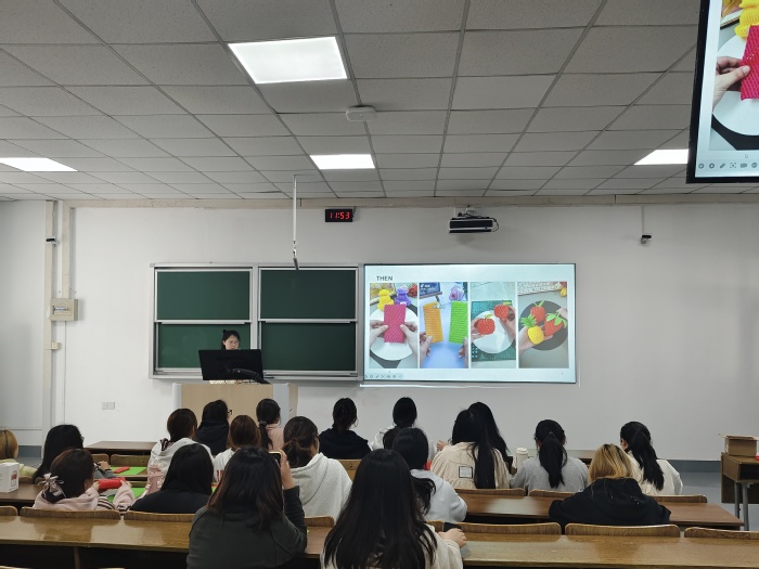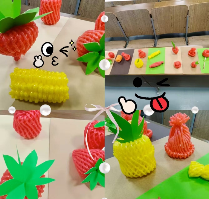 同学们有序签到入场,领取水果网兜、彩纸、剪刀等创作材料。在环保科普环节,工作人员通过PPT讲解环保知识,播放制作教学视频,现场指导创作要点,帮助大家打开创意思路。同学们充分发挥想象力,将废弃果网精心改造,搭配装饰材料,制作出造型别致、寓意丰富的环保手工作品。现场氛围轻松热烈,大家互帮互助,在实践中感受变废为宝的乐趣。