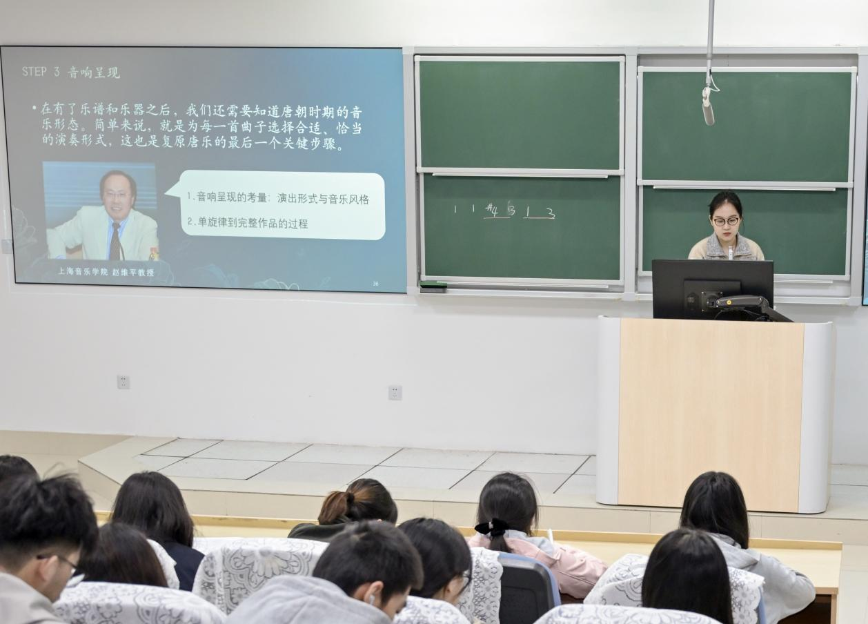 江老师用图片、视频等形式带领听众走近了一段被尘封在历史中的声音,也完整了解了唐代音乐从“消失”到“重现”的全过程。此次讲座一是阐明了为什么要复原唐代音乐。唐代音乐是自古以来,中华文明开放包容、交流互鉴的生动体现。二是理清了唐代音乐是怎样一步步被复原出来的。通过古谱解译、乐器复原、音响呈现等,让千年之前的唐代音乐重新响起。三是通过欣赏经典复原曲目展现了复原后的唐代音乐,让我们直观感受到唐代音乐的开放、多元与典雅之美。