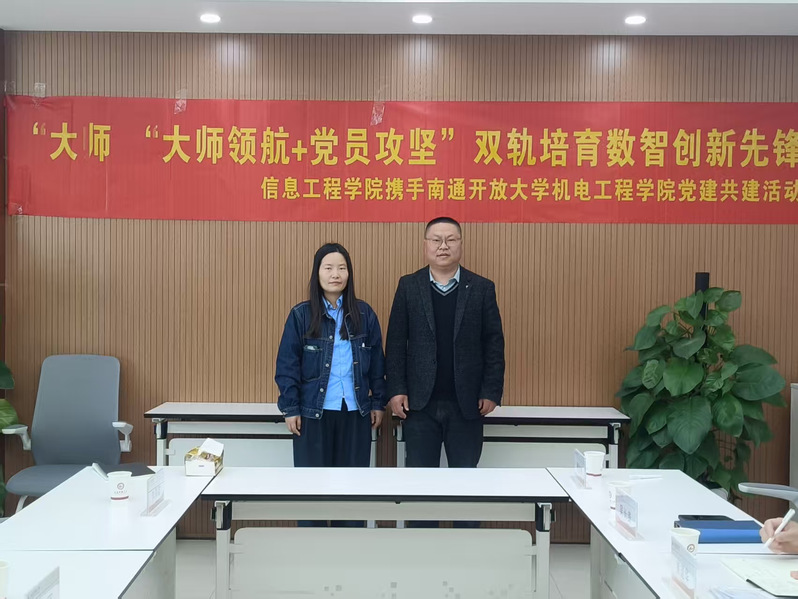 为深入落实新时代职业教育产教融合发展要求,探索党建引领专业建设的创新路径,4月24日,信息工程学院党总支书记王小军、机电工程系党支部书记谭亚平、计算机工程系主任李海波一行赴南通开放大学,与该校机电工程学院共同开展“大师领航,党员攻坚”双轨培育数智创新先锋党建共建活动,标志着双方在党建与业务深度融合领域开启全新合作篇章。南通开放大学机电工程学院院长黄道华、副院长孟玉喜、江苏省技能大师吴长贵及相关专业骨干教师参加本次交流活动。