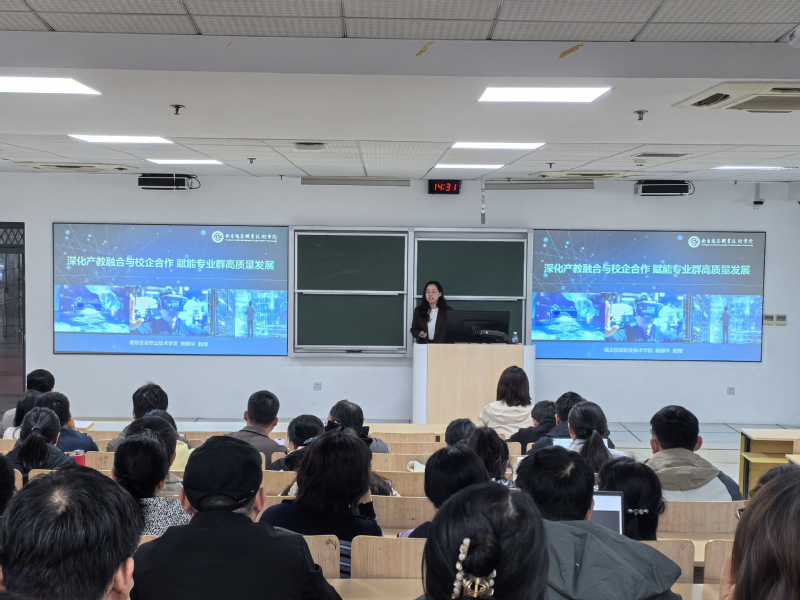 讲座以“深化产教融合与校企合作 赋能专业群高质量发展”为主题。杨前华首先梳理了南京信息职业技术学院专业群的发展历程,同步解读了我国产教融合政策的演进脉络——从平稳起步、快速发展到全面提升的三个阶段,清晰阐释了产教融合从“校企合作”“工学结合”逐步深化的内涵变迁,让全体教职工对产教融合的政策导向和发展趋势有了系统认知。