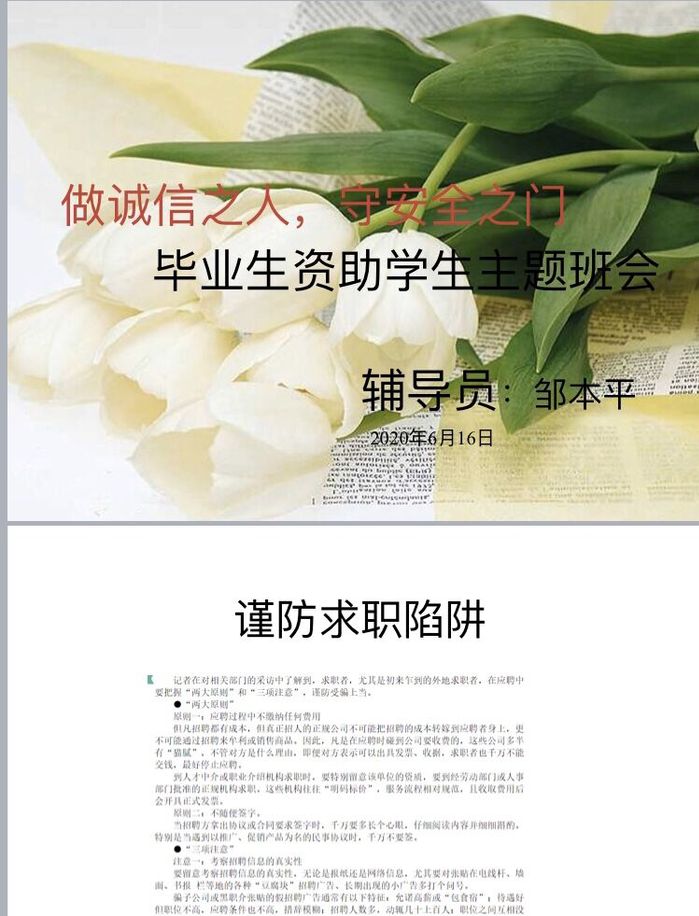为深入学习贯彻习近平总书记关于安全生产重要论述,贯彻落实党中央、国务院关于安全生产重大决策部署,根据我校2020年“安全生产月”宣传活动的通知,外国语学院团总支在全国安全宣传咨询日,6月16日晚上,在腾讯会议上开展了主题为“做诚信之人,守安全之门”的毕业生资助学生主题班会。会议由团总支副书记邹本平主持,学院全体接受资助的学生参加了会议。会议开始,各位同学一一汇报了自己的就业状况。然后邹老师结合具体的实际案例,提醒同学门谨防求职陷阱。在应聘中把握两大原则:不缴纳任何费用和不随便签字。提醒同学们在应聘前就要充分了解应聘单位,考察招聘信息的真实性,紧紧守住安全之门,确保自己的人身安全和财产安全。紧接着,邹老师宣读了《省教育厅办公室关于开展高校学生资助诚信教育主题活动的通知》(苏教办助函〔2020〕6号)文件,对资助学生进行了资助教育和感恩教育。提醒大家在国家开发银行学生在线服务系统中完成毕业确认工作。最后毕业班班长王雪同学代表受资助同学发言,表达了对学校的感激之情,并承诺一定会不负学校和社会的期望,毕业后努力工作,准时偿还学费贷款。本次主题班会通过开展诚信教育和求职安全教育,强化了学生的诚信