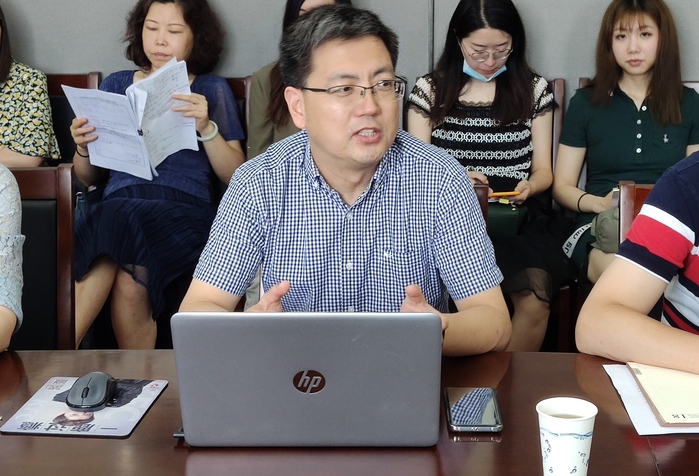 为了更好地做好“十三五”规划执行情况的总结,做好学院“十四五”规划的谋划工作,让学院教职工更好地理解、领会并践行学校第二次党代会报告的内涵与意义,2020年6月17日,外国语学院党总支部在古平岗综合楼二楼会议室顺利举行了党总支理论学习中心组扩大会议,再次学习了学校第二次党代会报告精神。学校党委常委、副校长牛玉韬同志担任主讲人。党总支部副书记章琼担任主持人。全体教职工参加了此次学习活动。牛玉韬校长用了一个多小时为外国语学院教师分享了题目为《党代会报告再学习,“十四五”规划续新篇》的辅导报告。首先,牛校长结合实际的案例,指出党代会报告的三个特点:新、远、实。回顾了江苏开放大学的发展历程,指出开放大学是我们几代人的追求,大学是我们的根本属性,开放是我们最大的特色。提出思想解放是根本,模式创新是路径。希望大家能对标校第二次党代会报告,紧扣十二项工程,紧盯硕士授予条件,科学谋划外国语学院的“十四五”发展规划,为建设有质量、有尊严的高水平开放大学继续努力奋斗。牛校长的分享深入浅出,生动有趣,深深吸引了在场的老师们。大家都聚精会神地聆听,认真地做笔记,受益匪浅。公共外语教学部主任方宇波老师代表老师们