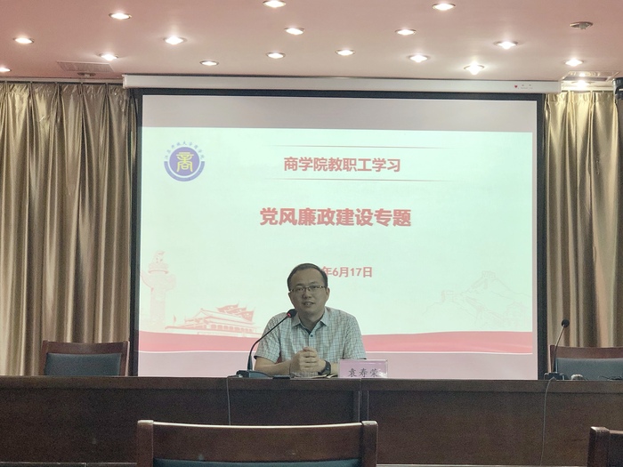 为进一步加强党风廉政建设,推进依法从教、廉洁从教,为学院高质量发展营造良好环境,6月17日下午,商学院在综合楼5楼报告厅组织党风廉政建设专题培训,邀请纪委办的同志作专题辅导,此次培训也是机关三支部深入学院开展“两服务一帮扶”的具体举措。培训会由商学院党总支书记袁寿荣主持,全体教职工参加。纪委副书记胡大华以“全面落实管党治党主体责任”为题作辅导报告,他强调全面从严治党,既需要全方位用力,也需要重点发力。加强和规范党内政治生活、加强党内监督就是重点发力的抓手。党要管党、首先要从党内政治生活做起,从严治党,首先要从党内政治生活严起。结合学校两级管理体制下,他强调学院全面从严治党,重点在于贯彻落实党政共同负责制和民主集中制情况,加强对权力运行的制约和监督。周霞副主任以“维护纪法权威,严守行为底线”为主题,着重介绍了《纪检监察机关处理检举控告工作规则》的内容,《中国共产党纪律处分条例》和《中华人民共和国政务处分法》(草案)对违纪违法行为的认定,并提出了如何贯彻执行《条例》和草案的几点建议。黄小宇以“规范开展巡察工作”为主题,详细介绍了什么是巡察、我校的巡察工作开展情况,并从党的政治建设、思想建设