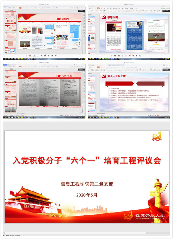 5月19日下午,信息工程学院第二党支部开展2019年3月批次入党积极分子“六个一”培育工程评议会。会上,支部书记张铁成介绍了本批次“六个一”培育工程一年以来的开展情况,各位入党积极分子结合“六个一”培育工程的要求,从思政认识、理论学习、社会实践、道德品质、文明素养和团结助人六个方面进行PPT汇报和自我陈述。吴竹青同学谈到,“心中有信仰,脚下有力量。当代中国青年要做新时代的奋斗者,葆有接续奋斗、艰苦奋斗、不懈奋斗的精神状态”,分享《习近平用典》阅读收获以及参加“力行杯”实践项目和参加家乡疫情防控工作志愿服务的经历;郭武朋同学谈到通过阅读《共产党宣言》进一步领悟了共产党人的初心和使命,在疫情期间拍摄抗“疫”云演讲视频,以实际行动支持抗“疫”并且在团委官微上发表读习近平总书记给北京大学援鄂医疗队全体“90后“党员的回信的感悟。王泽龙、丁静园、薛南同学也依次结合自己的思想、学习、工作、志愿服务情况进行了精彩汇报和充分展示。全体党员对各位入党积极分子的汇报情况、现实表现以及“六个一”培育工程手册的完成情况进行综合评议。自2018年以来信息工程学院党总支实施了入党积极分子“六个一”培育工程,至今已