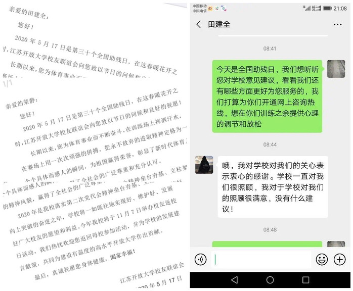 为提高全社会助残意识,弘扬人道主义精神,倡导扶残助残良好的社会风尚,在第三十个全国助残日到来之际,我校校友联谊会向15名残奥会运动员校友送去爱心和祝福。由于目前正处在疫情防控期间,校友联谊会向校友们发出了“致校友的一封信“”,感谢他们长期以来对母校的关注和支持,肯定了他们为国争光的奉献精神,并向他们发出诚挚的邀请,欢迎他们在今年的校友返校日重返母校。校友联谊会还通过在线方式向校友们了解他们当前的工作生活状况、面临的困难,并听取了他们对学校教育教学的意见建议。校友们收到母校的问候,非常激动,纷纷畅所欲言,表达了对母校的关心和挂念,并表示将继续以母校为荣,为国家和社会争得更多的荣誉。2020年是我校落实第二次党代会精神垒台夯基、立柱架梁、向上突破的奋进之年。学校将一如既往地实现好、维护好、发展好广大残疾校友的愿望和利益,共同携手开创我校残疾人事业美好明天,为建设有温度的高水平开放大学作出贡献。(学工处 马麟子)