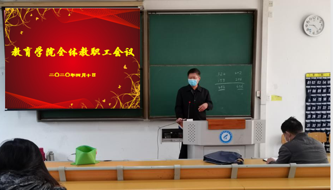 2020年4月10日上午,教育学院在定淮门东校区教学楼1-1阶梯教室召开学院全体教职工会议,传达学校相关会议精神,部署相关工作。校党委常委、纪委书记顾新华出席了本次会议并为教育学院上疫情防控第一课”,会议由学院党总支书记俞金元主持。纪委书记顾新华指出,防疫是硬任务,发展是硬道理,要坚持两手抓,一个也不能放松。要在抓好疫情防控的同时,制定学院工作目标任务,着力抓好二级学院管理、专业招生、课程建设、巡察等重点工作。全院教职工切实增强责任担当之勇、科学防控之智、统筹兼顾之谋、组织实施之能,更好地统筹推进疫情防控和学院发展各项工作。院长束正煌传达了全省高校2020年春季学期开学工作视频会议以及学校2020春学期院长工作会议、教学工作会议、科研工作会议精神。他要求全体教职工做好自我防护,遵守学校规章制度;精心组织线上教学,做好课后总结及反思;做到谨言慎行,上好学生返校后疫情防控第一课;坚守工作岗位,务实做好各项教学工作。随后,束院长对学院近期主要工作进行了部署。一是教学工作。他要求线上课程重视课程考核,教学团队精心组织教学研讨;针对无条件参加线上学习的学生,各教学团队可商定具体学习方式;优化体育