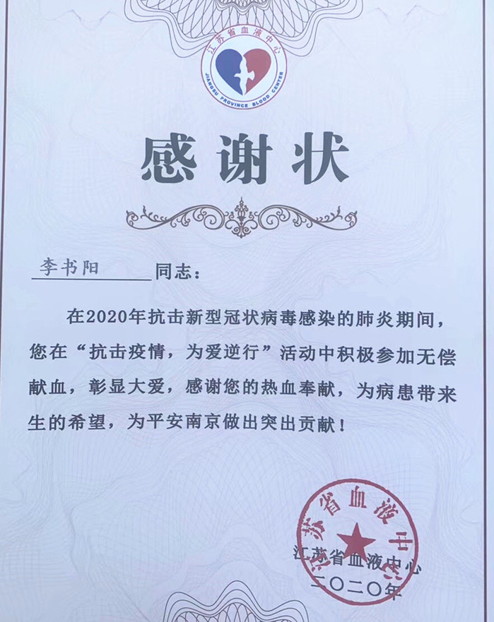 “今天,全国都在为抗击新冠肺炎疫情斗争牺牲烈士和逝世同胞表达深切哀悼,我也想在这个特殊的日子里去献血,为疫情防控尽点绵薄之力。”4月4日,李书阳在微信朋友圈晒出了自己参加无偿献血的照片。李书阳是我校2015级人物形象设计专业的校友,在校学习时一直担任班长。他说,“我每天都会用手机看疫情消息,同时也看到许多抗击疫情过程中令人感动的人和事,对我的触动非常大。虽然自己不能去抗击疫情的第一线,但献血也是力所能及的奉献,尤其在这个时候,献血更有意义。”在确保自己满足献血的一切条件后,李书阳来到江苏省血液中心新街口采血点进行了无偿献血,通过这种方式来助力“抗疫”。病毒无情,人间有爱。我校校友用自己的实际行动传播温暖、奉献爱心,书写着热血逆行者的风采。不论职位高低,不论天南地北,校友们正万众一心,众志成城,为坚决打赢疫情防控阻击战贡献自己的力量。(图/文:赵誉钦、张洁)