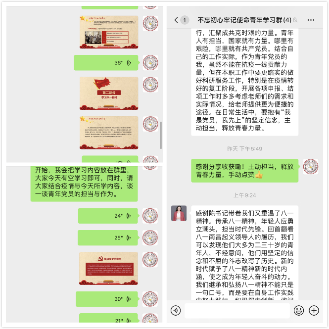 习近平总书记在2019年5月“不忘初心、牢记使命”主题教育工作会议上指出:“历史是最好的教科书。对我们共产党人来说,中国革命历史是最好的营养剂。”同时,他强调:“要认真学习党史、国史,知史爱党,知史爱国”。机关七支部为进一步提升青年党员的党性修养,于2019年下半年成立青年党员学习小组,并定期开展沙龙活动。2020年青年党员沙龙围绕党史学习开展,党史学习为自学与集体学习相结合,青年党员利用休息时间提前自学党史知识,每月由一位青年党员主讲,以专题形式带领大家集体学习党史重大事件。3月23日,机关七支部青年党员学习小组成员陈冰月同志以“南昌起义与八一精神”为题,利用微信群,带领大家进行线上“微学习”,她具体讲述了南昌起义的背景、经过及重大意义;详细剖析了八一精神的内涵;理论结合实际分享个人收获与感悟。她提到,青年党员首先,要坚定信念、不忘初心,坚定不移跟党走;其次,要勇担责任、开拓进取,在疫情复工期间,发挥青年党员的模范带头作用,在自己的工作岗位发光发热;最后,要脚踏实地、团结合作。朱燕菲同志谈到此次学习深刻领会了“八一精神”的丰富内涵,用心感悟追求真理、坚定信念、勇于拼搏、不怕牺牲、敢为