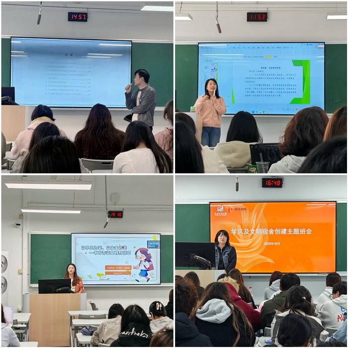 为深入贯彻落实“立德树人”根本任务,扎实推进“三全育人”工作,设计学院于10月组织开展“以学风为笔,以宿舍为卷”学风建设与文明宿舍创建主题班会活动。本次活动坚持以习近平新时代中国特色社会主义思想为指导,着力强化学生行为规范意识和主体责任意识,切实推进学风建设、环境整洁和管理有序的育人环境建设。本次主题班会活动是学院贯彻落实“一站式”学生社区综合管理模式建设部署要求的重要实践环节。学院严格遵循“教育先行、预防为主”的工作原则,组织全体辅导员深入教育教学一线开展实地指导。活动围绕“书写青春文明新篇章”主题,创新形式载体,将学风建设要求和宿舍管理规范转化为直观生动的现场教学内容,有效促进学生认知提升和行为养成。在班会活动中,辅导员们以高度的责任感和详实的案例分析,深入阐释优良学风对促进学生全面发展的重要意义,并指明安全文明宿舍环境对提升集体生活质量的保障作用。会议紧密围绕学生日常学习生活实际,重点部署“严格遵守课堂纪律、端正学习态度”的学风建设任务,同时对“人走断电、禁止使用违规电器、严禁在宿舍内吸烟”等安全管理规定作出具体说明。通过明确纪律要求,切实推动文明公约落地见效,为营造规范有序的校