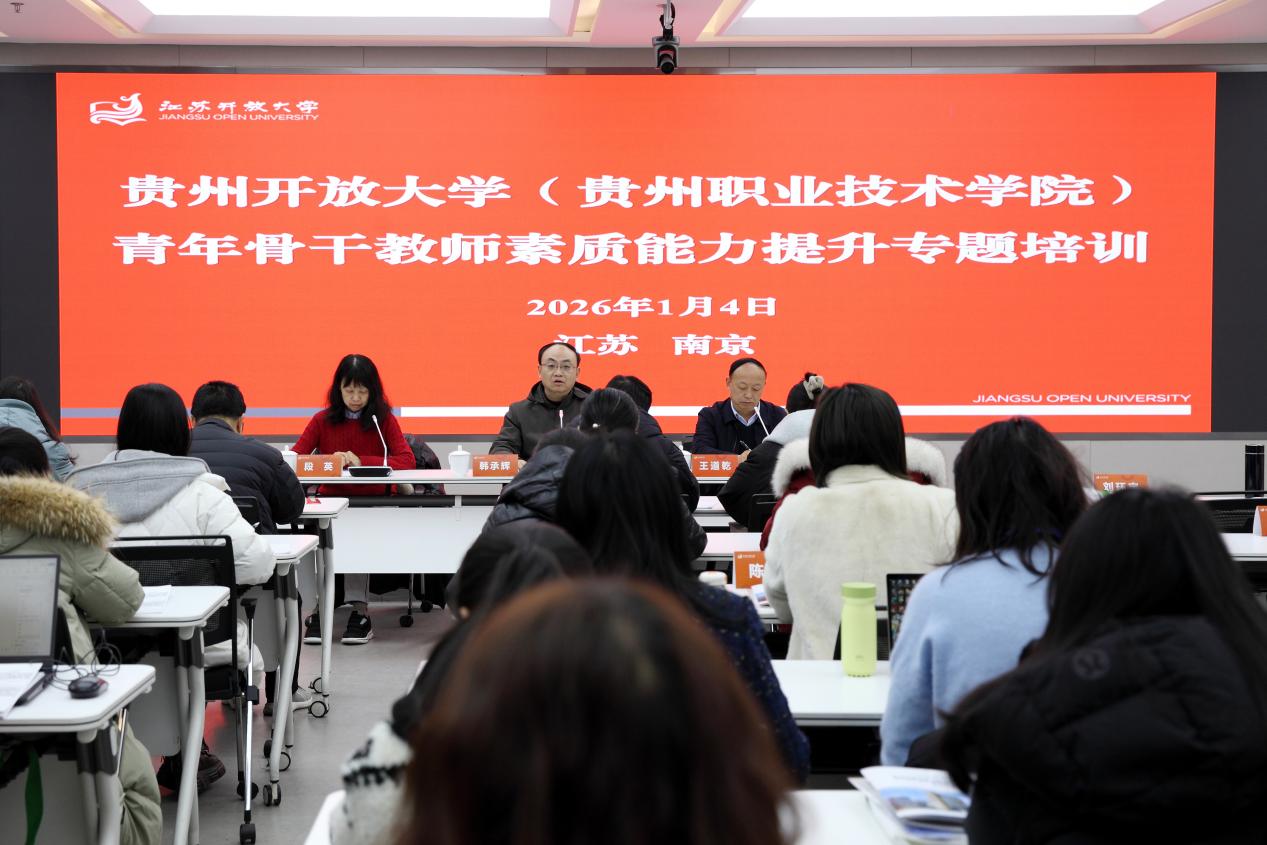 1月3日至9日,贵州开放大学(贵州职业技术学院)青年骨干教师素质能力提升专题培训班在我校举办,江苏开放大学党委常委、副校长韩承辉,发展规划处处长唐荣,环境生态学院党总支书记段英,贵州开放大学(贵州职业技术学院)正处级专职组织员王道乾出席开班仪式。来自贵州开放大学(贵州职业技术学院)50位骨干教师参加培训,培训由环境生态学院承办。开班仪式上,韩承辉代表江苏开放大学对培训班全体学员表示热烈欢迎,他指出,本次培训是两校深化合作、共谋发展的重要举措,希望全体学员学有所获、满载而归,期待双方能以此次培训为契机,在开放教育创新、职业教育改革等重点领域深化交流合作,共享先进经验与优秀成果,携手探索新时代高等教育高质量发展的新路径。王道乾对江苏开放大学表达了感谢,要求参训人员做到思想重视,学有所得;理实结合,学之有道;安全守时,学风优良,同时借此培训拓宽视野、理清思路,精准规划布局与锚定目标方向,为靶向施策提能筑牢基础。本次培训班课程内容丰富、针对性强,涵盖党的理论、课程思政、产教融合、开放教育教学改革、教学成果奖培育、专业建设等重点领域。培训采用专题授课、现场教学、案例研讨等多种形式,助力学员实现政