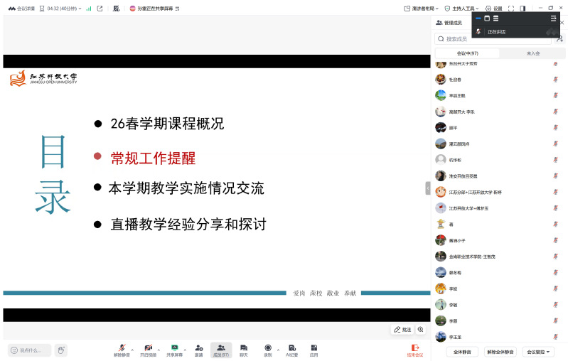 为进一步提升《文献检索与论文写作》课程导师的专业素养和教学指导能力,优化教学管理流程,切实提高课程教学质量,教育学院于2026年3月4日晚召开了2026春学期《文献检索与论文写作》课程线上教学研讨会。会议由辛甜甜主持,课程负责人孙雷与该课程的各位导师一起参会。研讨伊始,课程负责人孙雷从课程概况、常规工作提醒、本学期教学实施情况、直播教学经验分享等方面展开详细讲解。他指出,2026春学期,来自全省70多个教学点的共32998名学员选修这门课程,学员分为472个班,共155位老师担任课程导师,并提醒课程导师要及时批阅作业、保证在线时长。在讲解中,他还指出本门课程的考核方式发生了变化,从本学期起,由以往的过程性考核加终结性考核的考核方式改为了全过程性考核。接着,辛甜甜梳理了以往课程导师在工作中遇到的常见问题,并结合往期教学经验,给出了具体且可操作的应对策略。最后,课程导师们就遇到的各种问题和疑惑进行了充分沟通和深入讨论。本次线上教学研讨会的召开,进一步明确了26春学期《文献检索与论文写作》课程的教学要求和管理规范,有效解决了课程导师在教学实施中的诸多困惑。此外,会议还强调了专业课程导师团队建