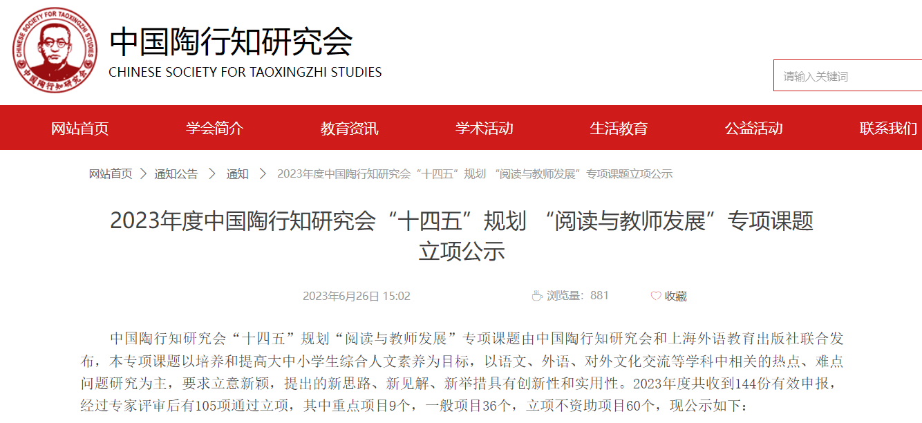 艺术学院获批中国陶行知研究会“十四五”规划“阅读与教师发展”专项课题立项
