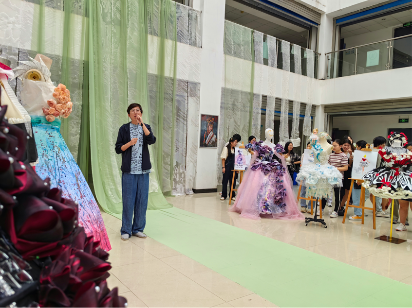 6月25日14时,艺术学院在应天校区图书馆四楼中庭举办《岗位基础技能实训》课程作品汇报展。参加此次活动的除了形象艺术系化妆品经营与管理专业、人物形象设计专业大一共五个班近两百名学生,还有艺术学院党总支书记丁姝娟、副院长王铮、党总支副书记张洁以及形象艺术系部分专业老师,此外还特别邀请了南京服饰学会会长周笑云、南京金莎美容美发培训学校校长孙胄胤参加本次活动。在老师的带领下,2023级化妆品经营与管理专业、人物形象设计专业大一同学通过为期三周的不断思考与创新设计,20余件立体人物造型和30余件平面设计作品脱颖而出,并在此次展览中集中展示。活动开始,副院长王铮对老师和同学的辛勤付出给予了肯定,鼓励大家创新思维、多课程融合,创作出更多更好的作品。活动现场,《岗位基础技能实训》课程的四位授课教师江航、邢献之、蔡丹丹、张潇予分别为大家介绍了课程的设计理念、实践过程以及完成情况。现场的同学或驻足观摩,或拍照留念,活动受到广大师生一致好评。本次课程作品展涉及海洋生态、宇宙与未来、绿色环保、传统文化等题材,将现实生活、想象与艺术造型语言结合,表达视觉和谐的创意设计,并利用纸和颜料材质的独特语言,打造人物造
