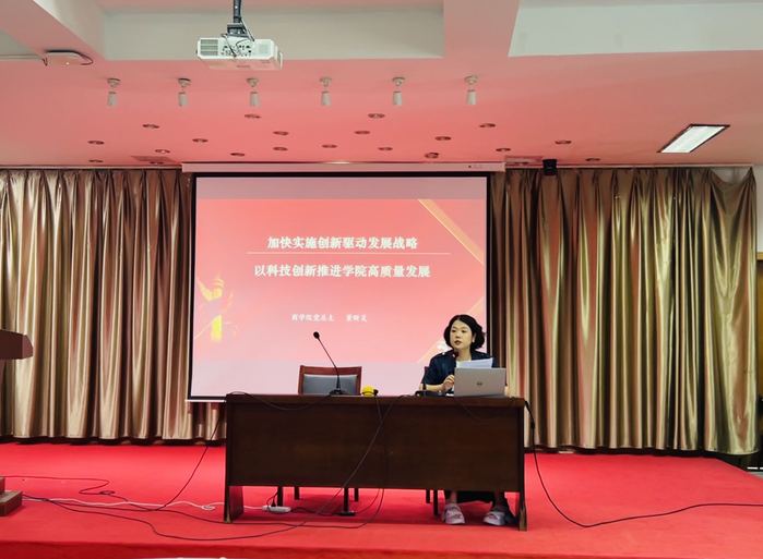 2023年6月21日上午,商学院总支副书记董昕灵在图书馆五楼报告厅讲授专题党课,主题为“加快实施创新驱动发展战略,以科技创新推动学院高质量发展”,商学院党总支理论学习中心组全体成员以及学院其他教职工参加学习会。会上,董昕灵从完善科技创新体系、加快实施创新驱动发展战略、科技兴校和科研兴院四个方面做重点阐述,全面诠释建设教育强国、科技强国、人才强国的重大意义,系统介绍学校出台的《科技兴校工程实施方案(2019-2023)》和学院出台的《科研考核实施细则(2023年度)》等文件精神。最后,她要求学院全体教职工要始终保持蓬勃朝气、昂扬斗志的精神风貌,脚踏实地、埋头苦干,将习近平新时代中国特色社会主义思想的伟力转化为实践和奋斗等动力源泉。随后,物流系主任张燕、会计系副主任袁始烨分别结合系部实际,讲述如何推动系部高质量发展的创新举措。高校是科技第一生产力、人才第一资源、创新第一动力的交汇点。此次授课和专题学习,全体教职工对学院今后高质量发展的重要意义、未来发展规划和目标责任有了进一步明确,未来,全体教职工将继续以“等不起”的紧迫感、“慢不得”的危机感和“坐不住”的责任感,在学院高质量发展的征途中昂