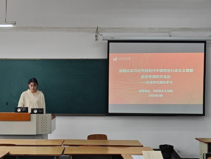 6月14日,学校理论社团新语学社分别在定淮门东校区和应天校区开展“深刻认识习近平新时代中国特色社会主义思想的世界观和方法论”专题理论学习会。马克思主义学院形势与政策教研部青年教师张丁月、刘敬东以及30多名社团骨干成员参加本次专题学习。东校区理论学习从“领学”环节开始。鲍晓云从“习近平新时代中国特色社会主义思想世界观方法论的科学内涵”和“习近平新时代中国特色社会主义思想世界观方法论的丰富发展”两个方面领学。她表示,要牢牢把握“六个必须坚持”,深刻领会党的创新理论最新成果,感悟思想伟力,贯彻落实到社团各方面的工作中。随后的“读原文”环节中,李佳诺、孙祝伟通过集中阅读研讨,推动社团成员深入学习习近平新时代中国特色社会主义思想,引导青年坚定历史自信,增强历史主动,找到个人的时代坐标,在大变局中坚守责任担当。“谈体会”环节,同学们结合自身实际,畅谈感想体会、踊跃交流心得,纷纷表示要积极担当作为,真正将理论学习成果内化于心、外化于行。最后的点评环节,刘敬东老师充分肯定了本次理论学习,他寄语社团成员,新时代青年要从习近平新时代中国特色社会主义思想中汲取精神养分和奋斗力量,积极投身到中国式现代化建设的