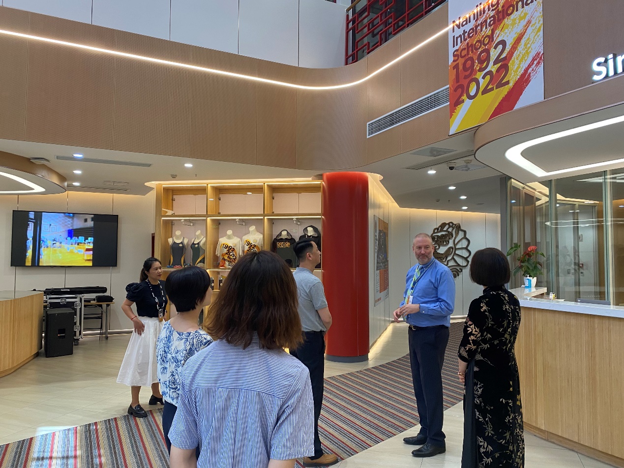 为深入开展学习贯彻习近平新时代中国特色社会主义思想主题教育,提升调查研究实效,助推汉语国际教育专业建设,加强与校友单位合作,6月12日下午,外国语学院院长杨远,党总支副书记章琼,应用语言系副主任、汉语国际教育专业负责人刘姮,开放学员管理人员等一行6人走访调研了南京国际外籍人员子女学校(NIS)。学院2022秋季入学的汉语国际教育专业学生付巍巍、葛蓉均为该校职工。NIS始创于1992年,是中国大陆第一所IB一贯制国际学校,致力于激励国际视野、个人卓越和创新思维。位于仙林的校区占地85,800平方米,包含小学部和中学部教学楼、表演艺术中心、社区活动中心大楼以及花园式的户外空间。学院一行受到了该校教学校长Kasson Bratton的热烈欢迎。他带领学院依次参观了NIS的体育设施、教学设施、大礼堂,并向学院介绍了NIS成立背景、发展历史、校园文化、教学理念、学生构成等。NIS优美的校园、独特的教学模式、完备优质的设施给众人留下了深刻的印象。随后,双方在会议室开展洽谈。杨远向校方介绍了江苏开放大学和外国语学院,刘姮博士介绍了汉语国际教育专业,江苏开放大学创新 开放 融合 共享的办学理念,服务全