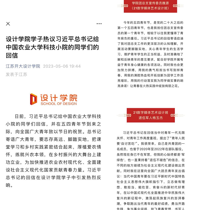 为学习宣传贯彻党的二十大精神,引导广大青年厚植爱国情怀,切实增强听党话、跟党走的思想和行动自觉,设计学院团总支五月围绕“学思践悟二十大 踔厉奋发启新程”、“探寻非遗魅力 传承传统文化”、“诚信感恩,立德立行”等主题开展丰富的团日活动。学思践悟二十大 踔厉奋发启新程学习习近平总书记给中国农业大学科技小院学生的回信。设计学院团总支积极响应学习贯彻习近平新时代中国特色社会主义思想主题教育的号召,组织支部学生认真学习习近平总书记给中国农业大学科技小院同学们的回信精神,厚植爱农情怀,练就兴农本领。做好常态化理论学习。为准确理解与深刻领会党的二十大精神的思想精髓与核心要义,引导青年学生深入学习习近平总书记关于青年工作的重要思想,设计学院组织各团支部以主题班会形式进行党的二十大理论学习。参观红色文化基地。5月25日,设计学院团总支组织21数媒班、22广告艺术设计1班两个团支部前往南京江北新区红色文化展陈馆,学习南京江北地区的革命历史,了解江北地区在中国共产党历史、中国革命史和中国工人运动史中做出的贡献,重温波澜壮阔的革命岁月。探寻非遗魅力 传承传统文化体验创意古籍灯制作活动。为进一步引领青年深入了解