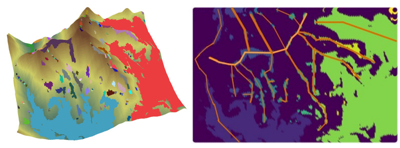 近日,信息化建设处张成老师设计了一种新的地形特征提取方法,有效解决了传统地形特征线提取步骤多、方法复杂的问题。相关工作以《Extraction of terrain ridge lines and valley lines based on agglomeration analysis of terrain points: a cluster analysis method》为题发表在《Earth Science Informatics》(JCR3区;影响因子:2.705)。该研究提出一种基于DBSCAN算法改进的山脊线山谷线提取方法。针对传统DBSCAN算法需要同时确定(ε, Minpts)两个参数才能实现一次完整聚类的局限,根据山地地形的特征,提出了一套针对此类地形的参数确定规则。常见地形特征线提取有基于图像、基于地形表面流水模拟及基于几个表面的方法,文章利用DBSCAN算法能够自动识别相似点的特性计算地形点的集聚情况,以聚类数量变化率最低时的情况作为其最佳参数选择,随后构建子区域之间的拓扑结构,结合地形中特征线的分布情况对拓扑结构进行剪枝,再根据特征线上子区域的高程分布确定所属特