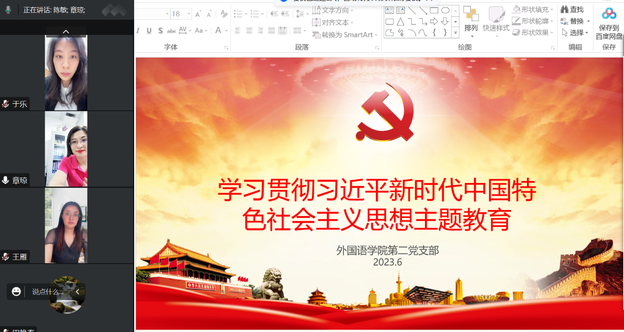 2023年6月6日,外国语学院第二党支部全体党员在线上开展主题教育专题党课学习研讨会。此次会议的主要内容是集中学习讨论校党委书记荆暄题为《深刻把握习近平新时代中国特色社会主义思想的世界观和方法论,加快推进高水平开放大学建设步伐》的主题党课,并且观看主题教育宣传片《嘱托·奋进》。会议之前,支部党员认真学习了主题党课的主要内容,会上大家分别从各自的角度对学校发展建言献策,提出个人思考。陈敏提出在工作方法上,大家提出要深入一线调查,找准发展的问题,精准施策,要找出“真问题”,避免形式上的“假问题”。发挥学校“受地支持,为地服务”的特点,与政府、企业建立“握手”联系,推动校企合作,聚焦人才培养和科研。为专业建设、学生就业、教师发展、科研创新打开新通道。王雁老师表示我们在工作中应该做到知信行统一,将学习成果转化为实际成效。倪玉琴老师针对主题党课中提出的“六个强”,给出了自己的理解和看法,在“顺应教育数字化,用好数智强推力”方面,她认为开放教育诞生并成长于技术环境,理应担任引领使命。随后全体党员一起观看了主题教育宣传片《嘱托·奋进》。通过这次学习研讨,党员们更加领悟到我们要学会用习近平新时代中国特