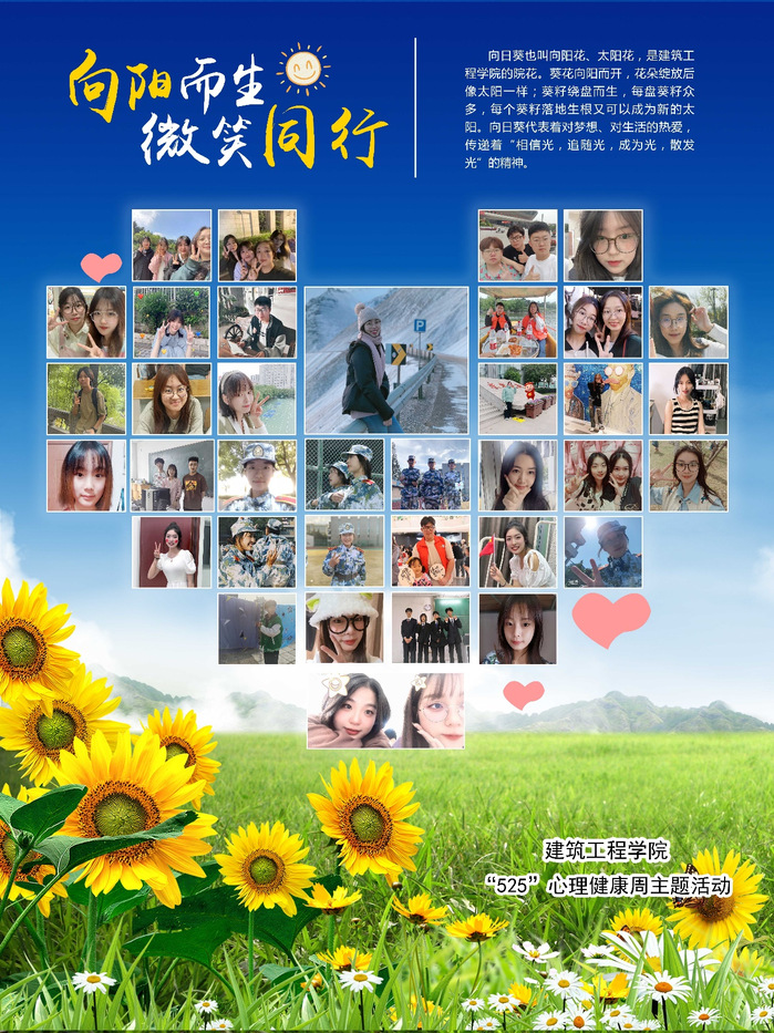 捕捉真挚笑脸,记录和谐校园。为展现建筑工程学院师生温暖乐观、积极向上的精神风貌,提升师生幸福指数。5月19日-25日建筑工程学院开展了“最美建工人”笑脸征集活动。学院师生们积极响应参加活动,记录下灿烂笑容的瞬间,将美丽自信的笑容大方展现,传递微笑的力量。活动过程中不仅增进同学们之间师生间的感情,增强心理健康意识,而且提升了学生的幸福感、归属感,帮助同学们更勇敢、更乐观、更幸福地面对人生。36张笑脸照片像院花向日葵一样绚烂,展示我院师生的阳光风采。也希望同学们如院花向日葵那样,热爱生活,拥抱梦想,向上向善,传递“相信光,追随光,成为光,散发光”的精神。通过此次微笑征集活动,展现我院学生昂扬向上的精神风貌,引导同学们更加关注自身心理健康,保持乐观积极、阳光向上的生活态度,进一步促进大学生身心健康成长,丰富校园文化生活。(文:崔璨/图:陈韦钰、丁文天、建工院学生/审核:徐亚)