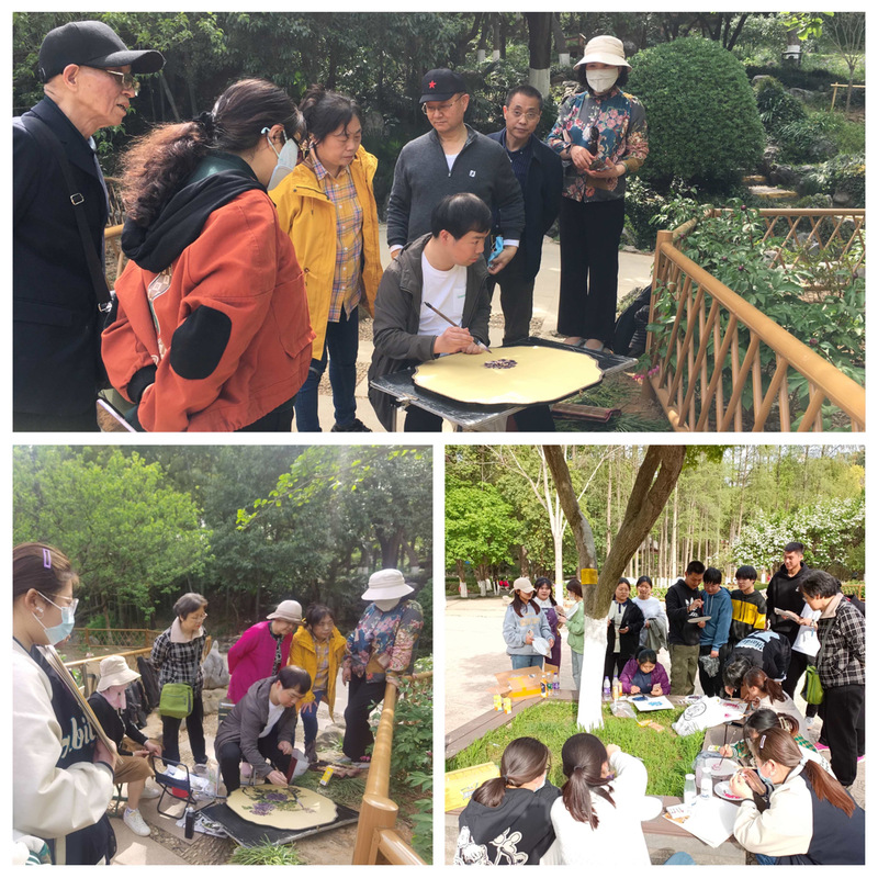牡丹花开艳,采风正当时。为进一步推动“一院一品”特色文化建设,传承和弘扬中华优秀传统文化,4月12日,艺术学院组织江开校友、学生社团成员以及班级心理委员,由文化休闲系文爽老师带队,于南京古林公园牡丹园齐聚一起绘画采风。最美春光不过四月,四时春光里绝胜却是牡丹。牡丹园里娉婷袅袅,千姿百态。此时此景不论是对在校尚显稚嫩的学生,还是对于早已经历半生沉浮的校友来说,都是美的感知,美的享受。“牡丹至今已有3000多年的历史,清代末年牡丹就曾被当作中国的国花,而如今牡丹也是我们艺术学院的院花……”文爽老师一边讲述牡丹作为国花的历史渊源、作为院花的文化内涵,一边娴熟灵动地在大宫扇上绘制牡丹花,让在场校友和同学们都领略了牡丹的几分神韵。大家在文老师的耐心指导下执笔、调色、着墨、晕染,用毛笔和颜料,在团扇和宣纸上绘出了自己心中最美的牡丹花。活动中,校友与同学们共同探讨创作心得,交流绘画经验,鼓励同学们在生活中多观察、多发现,提高审美能力。同学们则感叹于校友作品的精美、细腻以及充满了对自然、生活的热爱。此次活动结合学院品牌建设,将中华优秀传统文化教育充分融入活动设计,以花动人、以美育人、以文化人,引领校友