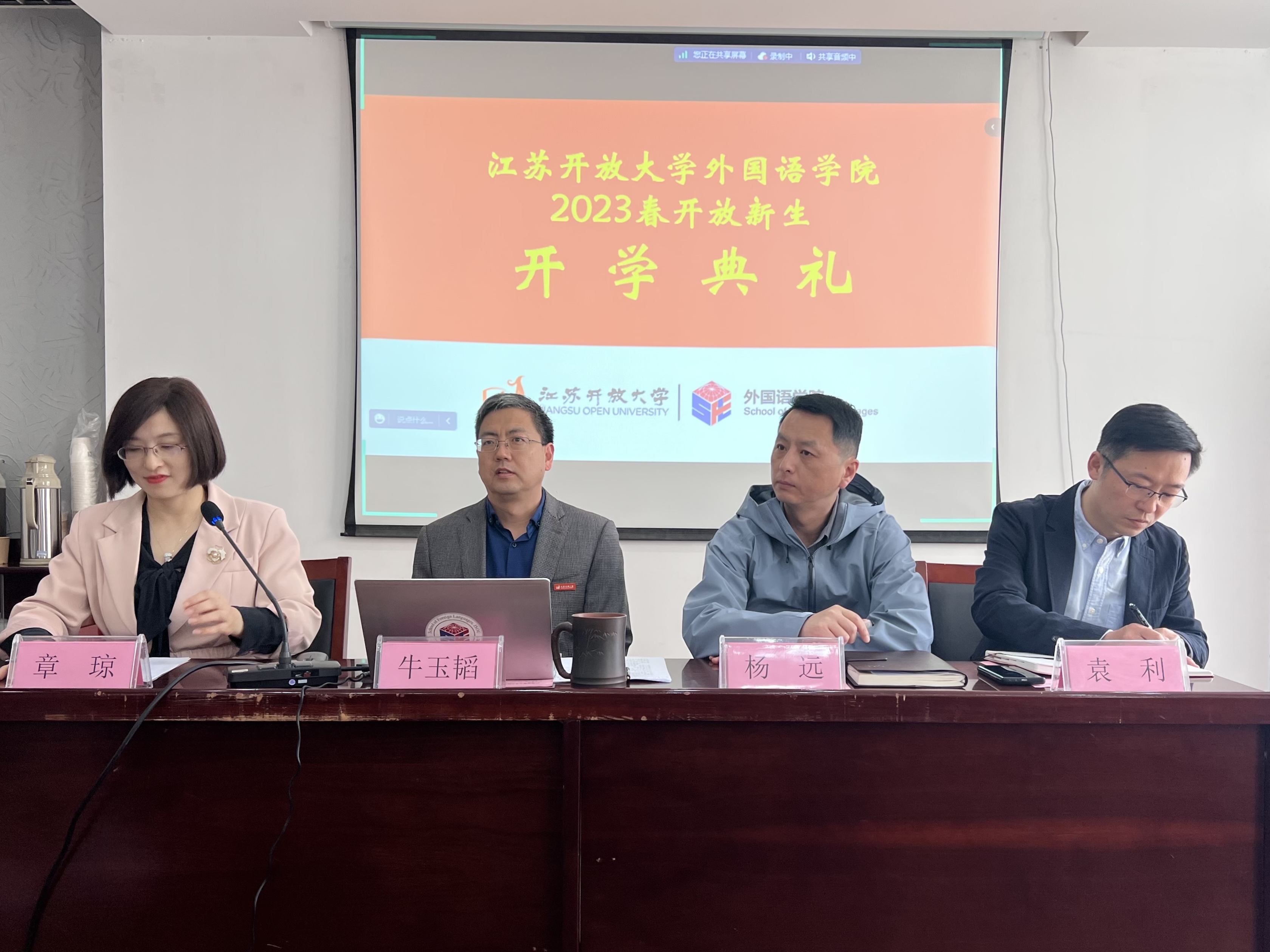 一树一树花开,燕在梁间呢喃,时值人间最美四月天。4月16日上午,江苏开放大学外国语学院2023春开放新生开学典礼在定淮门校区综合楼二楼第四会议室举行。校党委常委、副校长牛玉韬,全体院领导,汉语国际教育和商务英语专业负责人,学务导师,课程导师,以及来自沭阳、东台、贾汪、昆山、连云港、射阳等开放大学的学务导师和开放新生欢聚一堂。开学典礼由学院党总支部副书记章琼主持,线上线下同步举行。伴随着庄严的国歌声,典礼正式开始。牛玉韬首先发言,他代表学校对两个专业的2023春新生表示热烈欢迎,并为师生做“开学第一课”。汉语国际教育专业负责人刘姮、商务英语专业负责人蒋霞向学员分别介绍了两个专业的建设情况、专业特色、课程体系等,并对专业内涵进行了高度凝练:汉语国际教育“以汉语为桥梁,与世界交朋友”,商务英语“语言助力,商务赋能”。学务导师刘杨鑫对2022-2023学年学院开放学员管理状况进行汇报,预告了本年度的后期活动计划和安排,热情邀请学员积极参加,在更大的平台上发光发热。沭阳开放大学华冬冬向学员介绍了学务导师、课程导师职责,鼓励学员将学习作为一种生活方式,祝愿学员顺利完成学业。贾汪开放大学丁文靖作