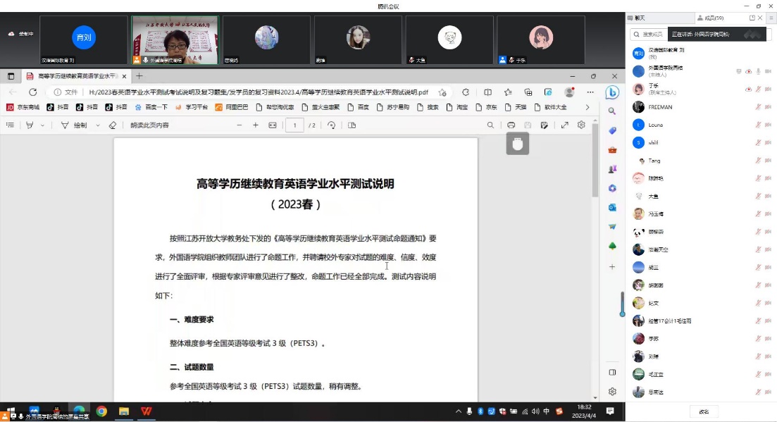 为进一步服务学员学习,提高英语学业水平测试通过率,助力更多的学员取得学位,外国语学院于4月4日晚通过腾讯会议举办了2023年春学期的英语学业水平测试考试辅导。辅导由学院副教授周桔老师主讲,参与人员由直属学员,合作办学点学员,全省汉语国际教育,商务英语专业学员和南通开放大学各专业的开放学员组成,多达70余人。 周桔老师首先介绍了本次考试的题型,难度以及要求。借助题库结合实际题型,对考点重点答题应试技巧进行了全面且清晰地梳理。其中重点讲解了两种题型的作文,通过对10篇不同类型的范文详尽地分析,对作文的格式、注意事项、写作技巧进行了系统的辅导。最后分享了科学实用的复习计划和高效的考试技巧。辅导结束后她为学员们的学习问题和复习问题答疑解惑。 本次培训使学员们了解了此次考试的应试技巧以及复习方法,帮助学员们从中进一步明确英语学习方法。外国语学院将继续做好对学员学习的支持服务工作。(图/文:于乐;审核:章琼)
