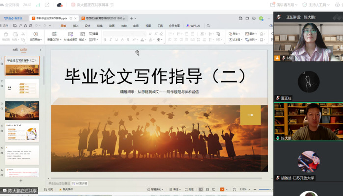 为进一步落实学校关于毕业论文通知的文件,切实提升学生学术写作能力与规范意识,近日,马克思主义学院召开思想政治教育专业本科毕业论文第二次集中辅导会。专业负责人陈大鹏作专题辅导,学院论文指导教师及全体学生共同参会,课程负责人林娟主持会议。陈大鹏以“精雕细琢:从思路到成文——写作规范与学术诚信”为主题,系统讲解毕业论文从框架搭建至最终定稿的全流程写作要领。他以“盖房子”为喻,强调论文选题如择地基、文献收集整理如备建材,而本次讲座重点是“如何施工”,即将前期准备转化为符合学术规范的完整论文。他围绕“结构蓝图—内容填充—合规装修”三大核心步骤展开深入讲解,解析了本科论文的标准架构,分别就摘要、引言、文献综述、框架结构、研究方法等部分的具体写作技巧进行剖析,并重点强调了学术规范与诚信底线。本次辅导会内容系统详实,兼具理论指导性与实践针对性,对提升学生论文写作的规范性、逻辑性与学术表达力具有显著的推动作用,不仅为学生提供了扎实的方法论支持,也体现了学院通过毕业论文环节落实“立德树人”根本任务的坚定决心,为培养高素质思政人才奠定了坚实基础。(文/图:林娟,审核:季海菊)