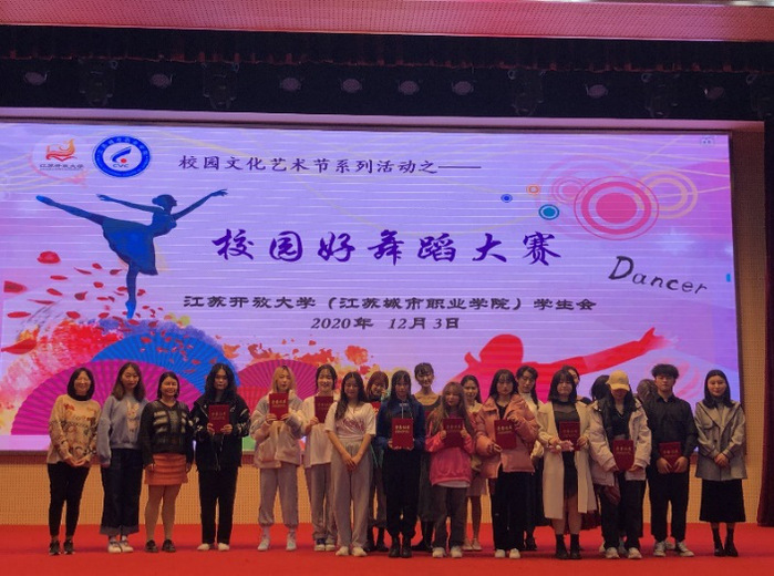 2020年12月3日18点30分,江苏开放大学(江苏城市职业学院)学生会主办的校园文化艺术节系列活动之校园好舞蹈大赛,在体艺馆406拉开帷幕。商学院团总支书记吴轲威、建筑工程学院团总支书记江蕾、艺术学院团总支书记何玉、信息工程学院团总支书记彭晓、环境生态学院团总支书记陈涛涛、校团委吴珊珊老师、校团委董安琪老师、校团委宋敏老师、设计学院孙晨老师担任此次比赛的评委。今晚,火热的青春,激情飞扬;今晚,五彩的梦想,绚丽缤纷;今晚,曼妙的舞姿,魅力四射。在主持人的介绍下,比赛正式开始。经过激烈的比拼后,最终奔波霸霸波奔组合以最高分获得本次大赛的一等奖;吉昕怡、twenty-three组合获二等奖;李佟冉、张凯婷、青涩年华组合获得三等奖;十四位选手赵佳姗、QQ炫舞小分队组合、美少女组合、今夜不熬夜组合、周锐、帅萤·马晴、vulgar scholar组合、黑曼巴组合、王怡帆、曾馨钰、陈骏祺、tough guy组合、张淑怡、气氛组组合获得优秀奖。获奖名单如下:一等奖:奔波霸霸波奔组合二等奖:吉昕怡、twenty-three组合三等奖:李佟冉、张凯婷、青涩年华组合优秀奖:赵佳姗、QQ炫舞小分队组合、美少