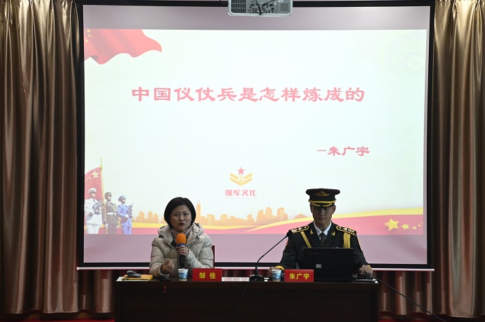 12月3日,设计学院在东校区图书馆五楼报告厅举办“爱国奋进·青年使命”爱国主义教育讲座,本次活动特别邀请到中国人民解放军三军仪仗队朱广宇教官作为主讲人,设计学院党总支部委员、全体辅导员、教师和学生党员、入党积极分子、学生干部等参加活动,由党总支部书记邹佳主持。朱广宇,2014-2019年服役于中国人民解放军三军仪仗队,曾先后执行2015年9·3阅兵,2015俄罗斯红场阅兵,2017建军90周年阅兵,2017巴基斯坦阅兵,2018白俄罗斯阅兵,2019国庆阅兵以及天安门广场升降旗仪式,迎接外国元首等仪仗司礼人物200余起。朱教官从“仪仗兵的选拔”和“仪仗兵的训练”两部分介绍了只有经过严格的选拔和辛苦的磨炼才能成为一名合格的仪仗兵。训练时为了防止头歪,便在领口两边别两根针;为了练习坚毅的眼神,战士们经常迎着烈日和狂风站立数小时;为了保证拍枪声音的统一,他们常常练到虎口裂开,鲜血染红了白手套……朱教官通过一个个鲜活的事例向学院师生展现了我国当代军人不畏艰难,甘于奉献的精神,并现场展示了军人的基本军姿。最后,朱教官通过总结仪仗兵爱国、无畏、坚毅、勇敢等等特质,勉励同学们要努力学习,勇于奋斗,为