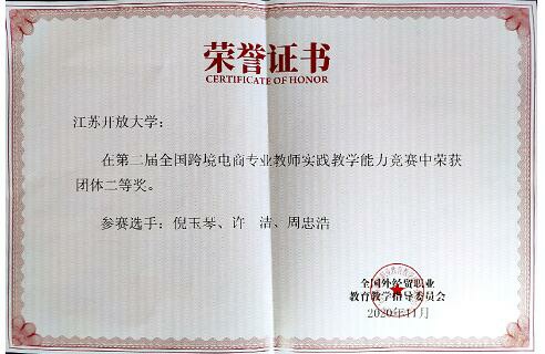 11月8日,我校商学院教师倪玉琴、许洁、周忠浩组队参加了由全国外经贸职业教育教学指导委员会主办的第二届全国跨境电商专业教师实践教学能力竞赛,与来自全国212所本科、高职院校共计430支参赛教师队伍展开竞争,经过三天紧张、激烈的角逐,最终获得团体二等奖的好成绩。本次大赛旨在深化全国教育大会及《国家职业教育改革实施方案》精神,进一步加强师资队伍建设,培养具有较高教学水平和较强实践能力的双师型师资。通过大赛,提升了我校商学院跨境电商专业教师的业务实践教学能力,推动了我院师资队伍建设与实践教学体系的构建,为完善实践教学体系积累了经验;同时,通过以赛促教、以赛促学、以赛促改、以赛促建的教学比赛样式,强化实践育人,推动师资队伍建设和专业办学质量的进一步提高,促进跨境电商高素质技术技能型人才培养质量的全面提升。(图/文:倪玉琴;审核:徐永兵)