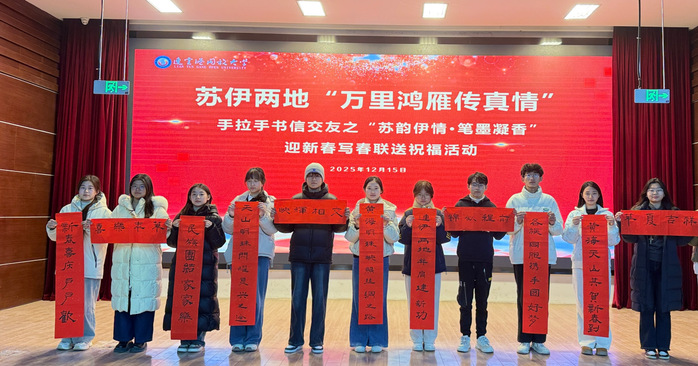 为弘扬中华优秀传统文化,扎实推进文化润疆工作,助力国家通用语言文字推广应用,进一步厚植苏伊两地各族人民的深厚情谊,近日,连云港开放大学联合江苏援伊前方指挥部及伊犁州相关部门单位,精心组织开展“苏韵伊情笔墨凝香”迎新春写春联送祝福活动。一幅幅饱含深情的春联,一声声真挚恳切的祝福,跨越山海,将连云港的暖意与牵挂送到伊犁各族群众心中。此次活动以春联为载体,深度融合中华优秀传统文化精髓与苏伊两地地域特色,通过春联创作、评选等系列环节,为伊犁州“最美家庭”及社会各界优秀代表送上新春的问候与期许。活动筹备阶段,校团委广泛发动师生参与春联创作,大家紧扣“民族团结一家亲”“苏伊友好往来”“一带一路美好愿景”等核心主题,挥毫泼墨间,将对边疆群众的祝福、对两地情谊的珍视、对祖国繁荣的期盼,都融入笔端、凝于纸上。经过层层筛选,一批主题鲜明、对仗工整、寓意深远的优秀春联脱颖而出,成为连接苏伊情谊的文化纽带。连云港开放大学党委书记、校长孙继才亲自提笔书写春联,“黄海辉映丝绸路,天山闪耀复兴途”,横批“国泰民安”。这副春联既展现了连云港作为沿海开放城市与伊犁作为丝路重镇的地域呼应,更彰显了在“一带一路”倡议指引下