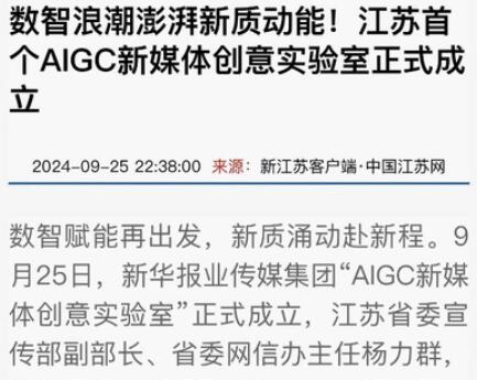 9月25日,新华报业传媒集团“AIGC新媒体创意实验室”正式成立,江苏省委宣传部副部长、省委网信办主任杨力群,新华日报社党委副书记、总编辑顾雷鸣为“AIGC新媒体创意实验室”揭牌。我校设计学院副院长孟刚教授被聘为研究员,聘任单位新华传媒、“学习强国”江苏平台。设计学院教师团队参与江苏首个“AIGC新媒体创意实验室”的筹备、成立,是江苏开放大学设计学院乘风数智浪潮、拥抱技术革新的加速奔跑重要举措。学院将搭建集教学研学、实训实践、创意生产、应用创新的一体化平台,与科创企业、知名高校共同探索AIGC媒体深融发展新路径。以下为报道链接:1.中国江苏网https://jsnews.jschina.com.cn/jsyw/202409/t20240926_3504309.shtml2.江苏新华网http://js.news.cn/20240926/9f68ccf2f80d45b888108c8ca7c7dc04/c.html3.江苏网信网https://www.jswx.gov.cn/jigou/shezhi/202409/t20240925_3504291.shtml4.新江苏https://m