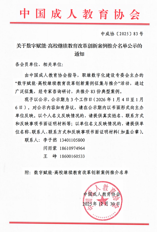 近日,由中国成人教育协会组织开展的“数字赋能·高校继续教育改革创新案例征集与推介”活动结果公布。全国共有83所高校案例获得推荐,其中江苏仅5所高校入选。由我校社会教育处牵头申报的《“三维赋能”构建社区教育师资培训新范式》案例成功获得推介。 本次案例征集活动旨在总结推广全国高校在继续教育数字化改革方面的先进经验与典型做法。江苏开放大学立足社会教育特色发展使命,围绕社区教育师资发展的现实需求,积极探索“数字赋能+教育创新”的融合路径,构建以“能力维度、技术维度、机制维度”为核心的“三维赋能”师资培训新范式。该案例系统阐述了学校如何通过平台搭建、资源整合、模式重构,推动全省社区教育教师队伍的专业化、系统化发展。 作为省内社会教育工作的重点单位和全国开放教育体系的骨干力量,江苏开放大学始终坚持服务社会、赋能基层的办学导向,在社区教育、老年教育、职业技能培训等领域积累了丰富经验。此次案例的成功推介,不仅是对学校近年来持续推进人才培养转型升级成果的充分肯定,也进一步彰显了学校在社会教育与数字化转型领域的创新实力与引领作用。 未来,江苏开放大学将继续发挥体系化、平台化优势,深化数字