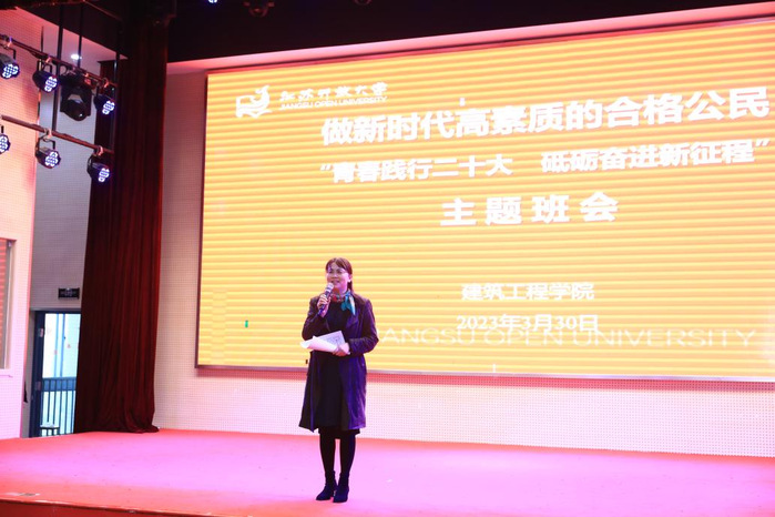 3月30日下午,建筑工程学院以《做新时代高素质的合格公民》为题,在应天校区体艺馆406多功能厅,召开了2023年春学期“开学第一次主题班会”,分享践行党的二十大精神,围绕爱国、团结、奋斗、科学、互助”五个关键词,通过学生们自编自导自演的情景剧,引导同学们思考如何做新时代高素质的合格公民,如何将“小我”成长融入“大我”奋斗,让“小我”的青春里有“大我”的家国情怀,责任和担当。江苏开放大学党委副书记、副校长金丽霞,建工院党总支部书记曹永、副书记徐亚,校学工处、团委负责人、各学院党总支部副书记和学工办主任现场观摩,建工院全体辅导员与21级、22级学生代表一起参加了主题班会。此次主题班会打破传统班会模式,采用“学生自编自导自演,老师参与”的“翻转”形式,以情景剧演绎让主题班会“活”起来。情景剧的时间横跨新生入学到大学毕业,通过一个宿舍的四名同学在大学期间的学习生活、内心变化和成长历程,生动展示了不同地选择带来的不同青春轨迹,反映了当前学生关注的主要问题、存在的思想困惑和实际需求,体现了同学们在大学期间对理想目标、责任义务、自我实现等方面的观察和思考。话剧最后通过“一场梦”的情节反转和激情洋溢的