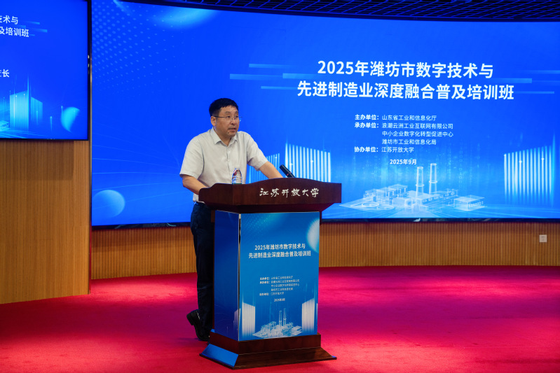 9月23日至26日,我校成功举办2025年潍坊市数字技术与先进制造业深度融合普及培训班。本次培训由山东省工业和信息化厅主办,浪潮云洲工业互联网有限公司、国家级中小企业数字化转型促进中心、潍坊市工业和信息化局承办,江苏开放大学协办。本次培训聚焦数字技术与先进制造业的深度融合,通过专题讲座、企业现场研学、学习分享等多种形式,为学员搭建了一个全方位、多层次的学习交流平台,让学员在理论与实践的碰撞中,深入领略数字技术赋能制造业的魅力与力量。党委常委、副校长耿焕同,信息工程学院相关人员出席活动。潍坊市工业和信息化局二级调研员刘启华,来自潍坊市工业和信息化局数字化转型相关负责人、企业负责人、技术骨干等共80余人参加培训。在专题讲座环节,本次培训邀请了多位行业专家进行精彩授课。北控集团南京优倍电气技术有限公司总经理董健以《以智改数转促进企业高质量发展及案例》为题,深入解读了企业数字化转型的内涵与价值,从战略规划、实施步骤到实际案例分享,清晰勾勒出企业迈向高质量发展的数字化路径。联通(江苏)产业互联网研究院院长、正高级工程师周斌在《人工智能赋能产业升级转型》的报告中,为我们剖析了人工智能技术的演进趋势