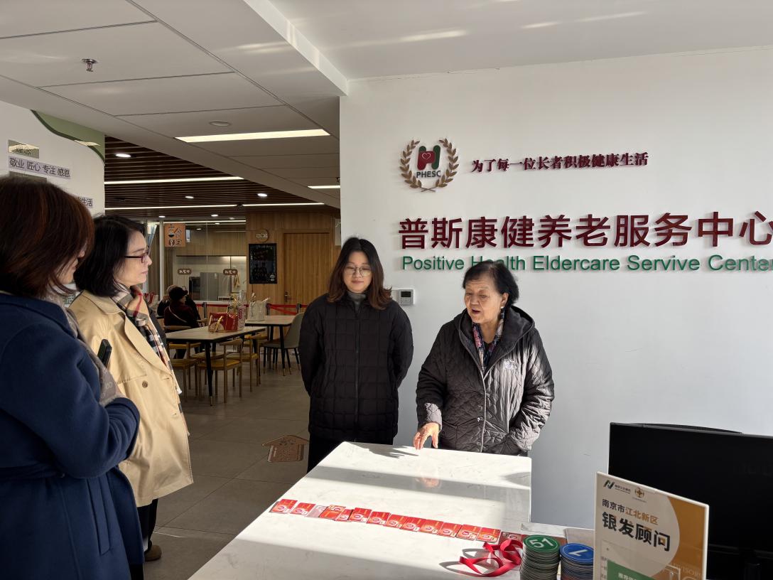 为深入推进老年教育与养老服务融合发展,开展打通老年教育最后一公里的路径探索,12月3日上午,校党委常委、副校长杨羽带队赴南京普斯康健养老服务中心进行深度走访调研。在东南大学国际老龄化研究中心主任、南京普斯康健养老服务中心创始人张肖敏的陪同下,杨羽一行先后参观了位于江北新区顶山街道、泰山街道的3个社区养老服务点。南京普斯康健养老服务中心创建于2016年,坚持以老年人为主要服务对象,以“社区居家”和推进“医养结合”为发展方向,“上门照护”与“精神运动健康”为特色,致力于提供“专业化、个性化、标准化”的服务,在江北新区拥有15个深入社区的服务点,设有家庭医生工作室,开展慢性病精细化管理等基本公共卫生服务。结合“小北医养”品牌,打造老年人“健康守护中心”,为老人提供日间照料、智能健康体检、健康教育、疾病预防、心理疏导等站点服务。普斯康健集社区居家养老、基础医疗、康复照护、健康促进等功能于一体的多元化服务网络,累计服务已近3万人、60多万人次。调研团队详细考察了活动室、认知照护中心、家庭医生工作室、运动促进健康中心、适老化辅具室、手工坊等功能区,其完善的设施和“社区嵌入式”医养结合的服务模式给调