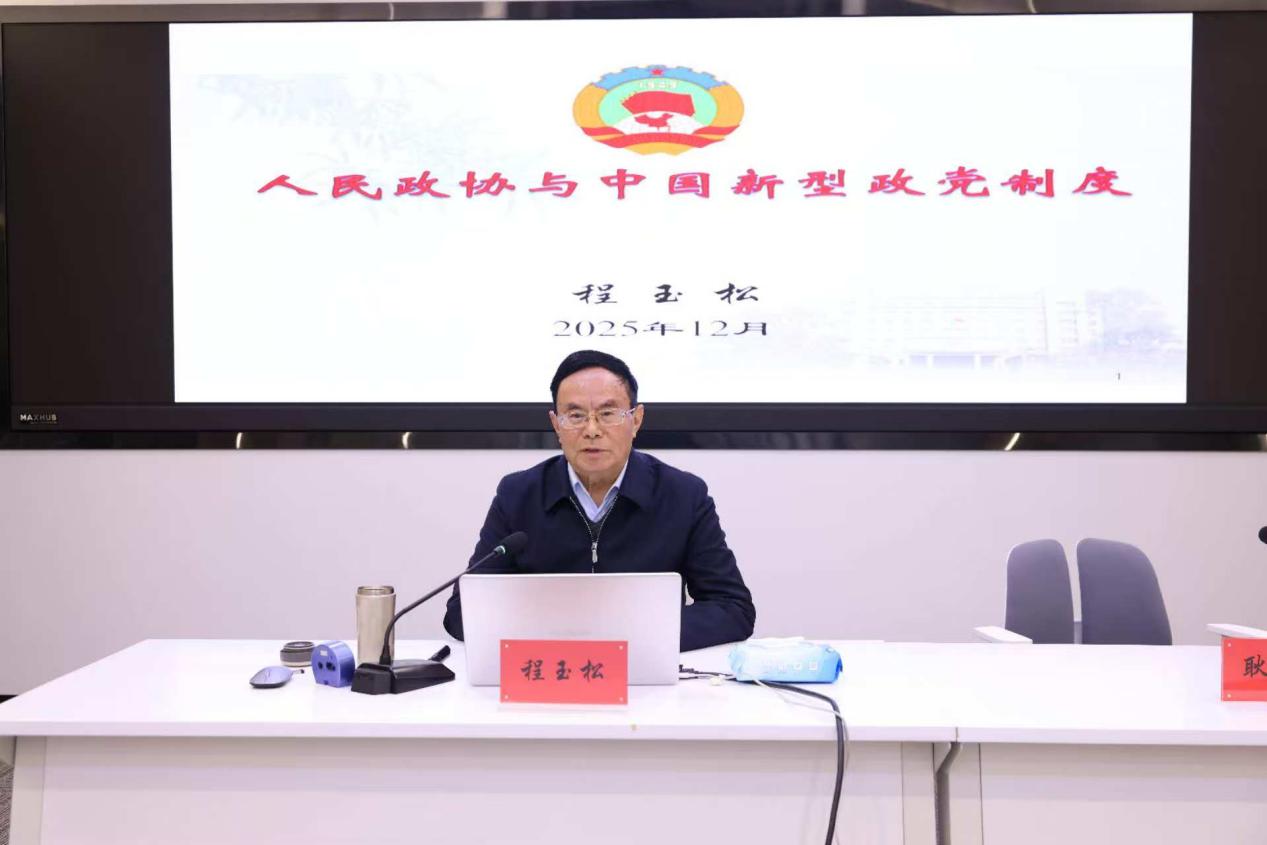 中国共产党领导的多党合作和政治协商制度是我国一项基本政治制度。为进一步推动党的创新理论入脑入心,12月23日,学校特邀江苏省社会主义学院兼职教授、江苏省领导干部高校思政课师资库成员程玉松,为我校学生讲授了一堂主题鲜明、内涵深邃的思政课。学校高度重视领导干部上讲台讲思政课工作,此次活动,校党委书记丁荣余精心部署,校长张迎春现场与专家交流,副校长耿焕同主持活动。程玉松曾担任县委办公室主任,省委办公厅副处长、处长,省委农村工作领导小组办公室副主任,省政协副秘书长、研究室主任。他以“人民政协与中国新型政党制度”为题,结合自身深厚的理论素养和丰富的实践经验,系统梳理了中国新型政党制度的形成和发展,深刻分析了中国新型政党制度具有的鲜明特色和显著优势,详细阐述了人民政协是实行新型政党制度的重要政治形式和组织形式,将理论融入历史脉络与现实实践,以生动的案例和鲜活的语言,为师生们呈现了一堂既具理论深度又富有实践温度的思政课。 程玉松指出,中国新型政党制度,植根于中华优秀传统文化,孕育于近代中国民主革命进程的伟大政治创造,形成于协商筹建新中国的伟大实践,发展于社会主义革命、建设、改革的伟大进程,完善于中国