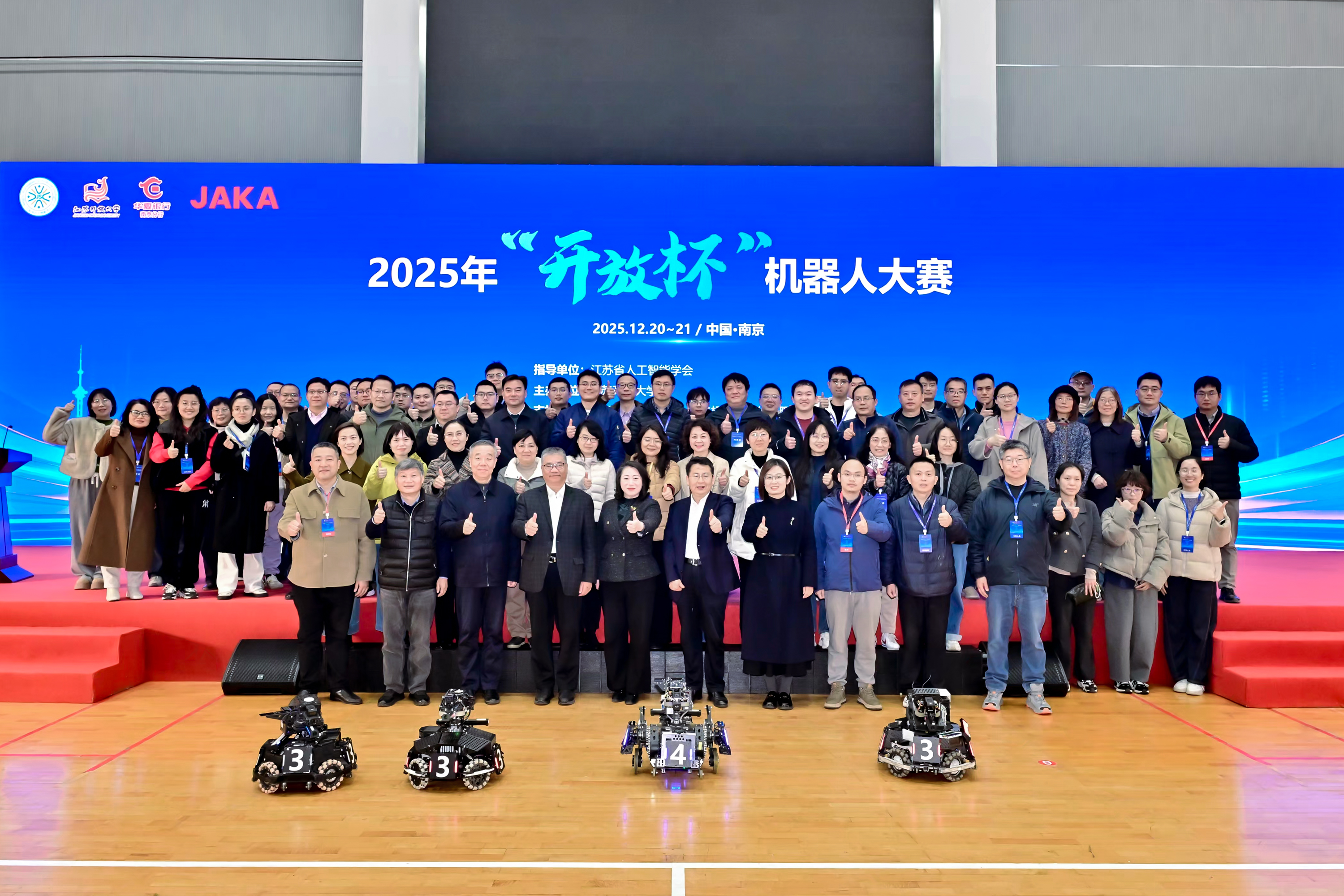 2025年12月21日,第二届“开放杯”机器人大赛于江苏开放大学应天校区体艺馆顺利闭幕。来自省内外各开放大学及普通高校的16支代表队、近200名师生齐聚一堂,共同参与了机器人技术竞技与学术交流活动。本届大赛由江苏开放大学主办,并获江苏省人工智能学会悉心指导,以及华夏银行南京分行与节卡机器人股份有限公司的鼎力支持。大赛旨在激发广大师生对机器人技术的兴趣与创新潜能,推动理论知识与实践应用的深度融合,加强高校间的技术交流与合作,共同促进机器人技术领域的创新与可持续发展。江苏开放大学党委副书记、校长张迎春出席大赛开幕式。学校党委委员、副校长杭祝洪,江苏省工业和信息化厅原党组成员、机关党委书记姜良,华夏银行南京分行党委委员、副行长李德群一同出席并致辞。东南大学机器人与生物机械电子实验室主任王兴松教授作题为《重载全方位移动技术创新及应用——从足球机器人到国家重大工程装备》的主题报告。本届“开放杯”机器人大赛以机器人对抗形式开展,各参赛队需自主研制机器人,在指定场地内进行射击对抗,最终依据剩余血量判定胜负。经过激烈角逐,南京理工大学(Alliance)荣获冠军,东南大学(3SE)获得亚军,江苏开放大