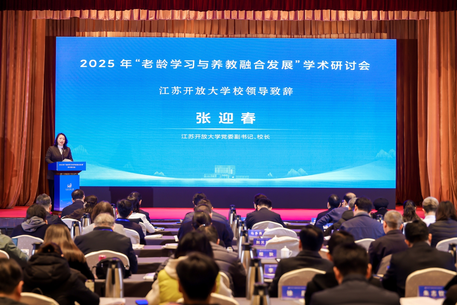 12月18日,由江苏省老龄事业发展研究会(老龄文明智库)老龄学习与精神生活研究专业委员会主办,江苏开放大学(江苏老年开放大学)承办,南京师范大学协办的“老龄学习与养教融合发展”学术会议在南京举行。江苏老龄事业发展研究会会长王燕文、副会长杨勇,江苏省教育厅校外教育培训监管与社会教育处副处长张赟,江苏开放大学党委副书记、校长张迎春等出席会议。会议汇聚了来自全省老龄事业研究机构、高校银龄学习中心、省示范性老年大学、开放大学办学系统及康养头部企业的近200位专家学者与实务工作者。党委常委、副校长杨羽主持论坛。张迎春指出,面对人口深度老龄化的省情实际,“老龄学习”与“养教融合”已成为践行积极老龄观、推动老年教育高质量发展的关键路径。她强调,学校将坚持“开放致用、数智创新”,以生态化、数智化、技能化、特色化、效能化的“五化”发展要求为引领,积极构建多元协同的老年教育共同体、打造智慧学习新生态、培育“老有所为”的银发工匠,努力形成可推广的“江苏样本”,为老年人创造更有品质、更富活力的学习生活。江苏开放大学党委副书记、校长张迎春致欢迎辞中国老年大学协会学术委员会副主任周延军深入阐释了老年教育从“娱乐型