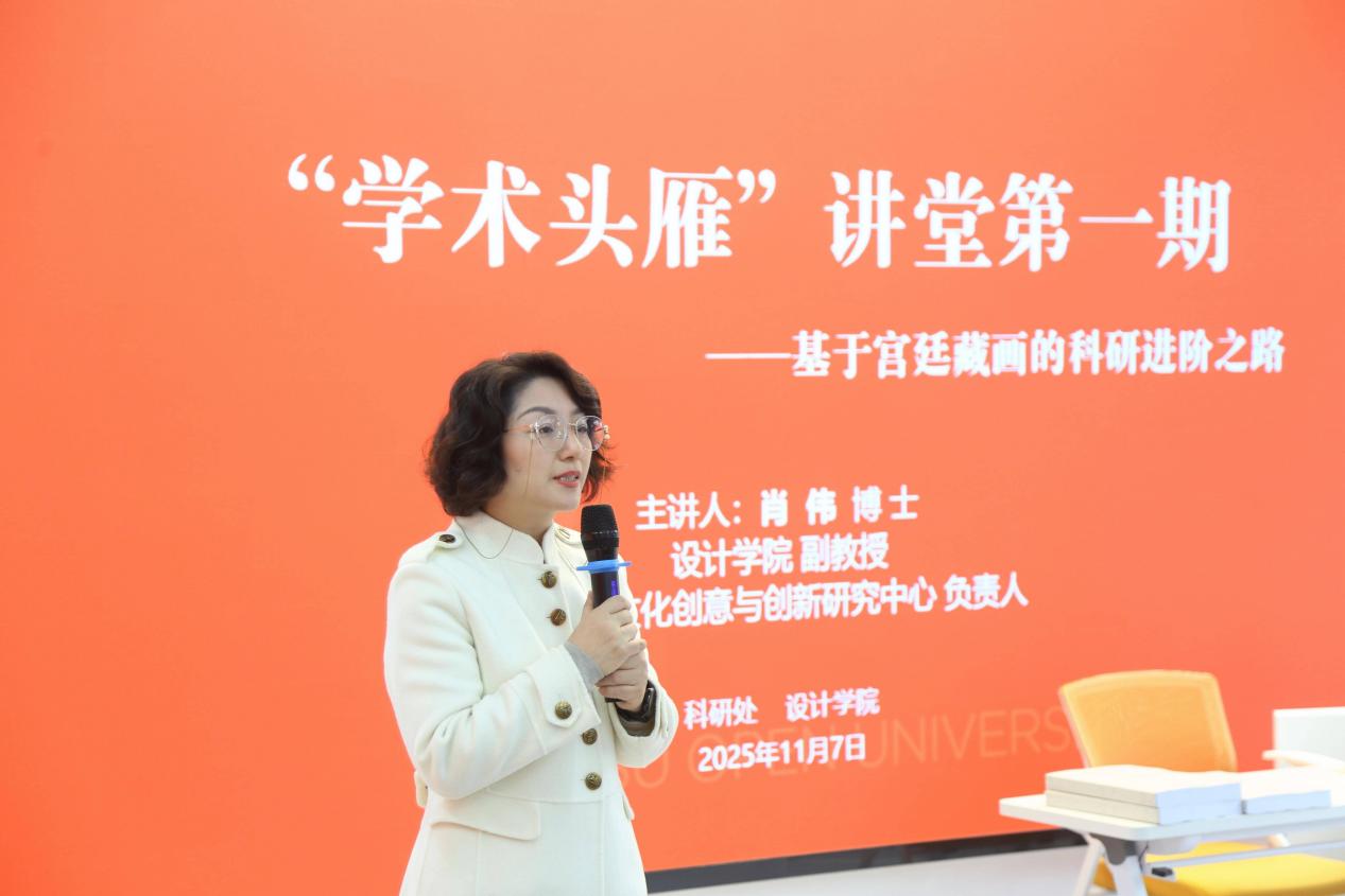 2025年11月7日上午,我校第十九届科技活动月系列活动之“学术头雁”讲堂第一期在东校区实验楼101文科实训中心顺利启幕。副校长张晓、设计学院副院长孟刚,各学院科研平台及团队负责人、近三年引进的青年博士代表齐聚现场,共同参与这场学术盛宴。活动由科研处负责人虞晓骏主持。活动伊始,张晓发表致辞,充分肯定了学校“十四五”期间在高水平论文、国家级项目、横向科研到账经费等方面取得的显著成绩,强调这些成果的背后是全体科研工作者的不懈奋斗。她指出科研团队建设是有组织科研的重要抓手,未来学校科研团队建设将秉承“自主申报、动态管理”的核心逻辑,更以不拘一格的组织形态、兼容并蓄的协作理念,打破学科壁垒与形式束缚,广泛吸纳跨学科力量、承载多元研究方向,为科研创新培育更开放包容的生长土壤。本次学术讲座不仅是一次思维的碰撞,也是一次平台建设成果的展示。肖伟以“基于宫廷藏画的科研进阶之路”为题作专题报告。她清晰梳理了自身的科研脉络,从博士阶段聚焦《宣和画谱》研究切入,逐步延伸至明代宫廷藏画领域,构建起完整研究链条。打破了文献学研究的传统范式,创新融入传播学等跨学科研究方法与视角,形成了独树一帜的研究路径。从明代宫