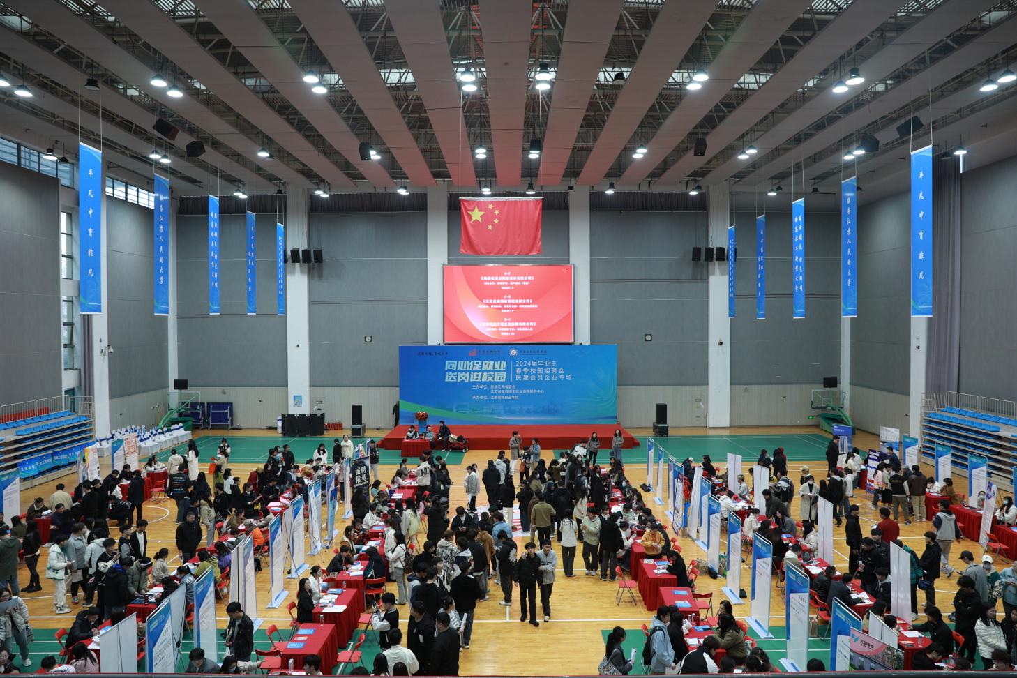 为落实就业优先战略,实现高质量充分就业,3月25日下午,由民建江苏省委会、江苏省高校招生就业指导服务中心主办,我校承办的2024届毕业生春季校园招聘会——民建会员企业专场在应天校区体艺馆举办。民建中央副主席、民建江苏省委主委、省政协副主席洪慧民,江苏省教育厅二级巡视员、机关党委副书记周玖华,民建江苏省委会社会服务处处长吴丹,民建南京市委会秘书长何洋,民建江苏省委二级调研员、民建江苏省委会直属工委副主委王鸿博,省高校招生就业指导服务中心党总支书记缪榕楠和我校党委副书记、校长丁荣余、副校长张晓参会。招聘会由校党委副书记牛玉韬主持。洪慧民指出,民建作为密切联系经济界的中国特色社会主义参政党,充分发挥界别特色和优势,为稳就业、促发展、惠民生贡献力量义不容辞。民建江苏省委会通过此次就业双选会建立起“双向奔赴”的就业桥梁,积极为民建会员企业和即将踏入社会的高校毕业生搭建起选才就业的广阔平台,既助力毕业生更充分更高质量的就业,也为企业选用专业技能型人才提供丰富的资源,实现“双选”共赢。希望会员企业彰显企业社会责任,不断激发毕业生创新发展的活力,做到爱才、育才、兴才、聚才、用才;希望江苏城市职业学院能