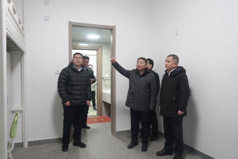 1月3日下午,江苏省教育厅厅长、省委教育工委书记江涌调研我校新校区建设情况,对扎实推进新校区建设工作提出要求。省教育厅办公室、发展规划处负责同志陪同调研。丁荣余校长代表学校汇报了新校区的规划设计、建设进展、产教融合情况。江涌一行首先来到一期一标段,重点考察了已建成的食堂、宿舍、开放学生轮训公寓,并详细了解了学生宿舍样板间的功能布局、建筑装修材料等情况。在建设中的一期二标段,重点考察了实验实训组团建设情况,并与公建中心、施工单位工作人员进行了深入交流,具体了解工程建设进度、项目管理情况。在项目管理部,重点了解了新校区二期规划设计情况。江涌厅长对我校新校区的规划设计和建设情况给予高度评价,并提出三点要求:一是学校要负起建设主体责任,加强全过程监管,与省公建中心、施工单位深度配合,确保施工安全、质量和进度,确保农民工工资按时足额发放;二是要进一步优化设计,重实用,突出江苏特色、南京特色和学校特色,把学校建成服务地方经济社会发展、培养高素质技能型人才、服务江苏全民终身学习的广阔舞台;三是要提前谋划各项相关工作,组织师生到新校区参观和现场体验,听取意见建议,加大宣传力度,把新校区建成师生员工向往